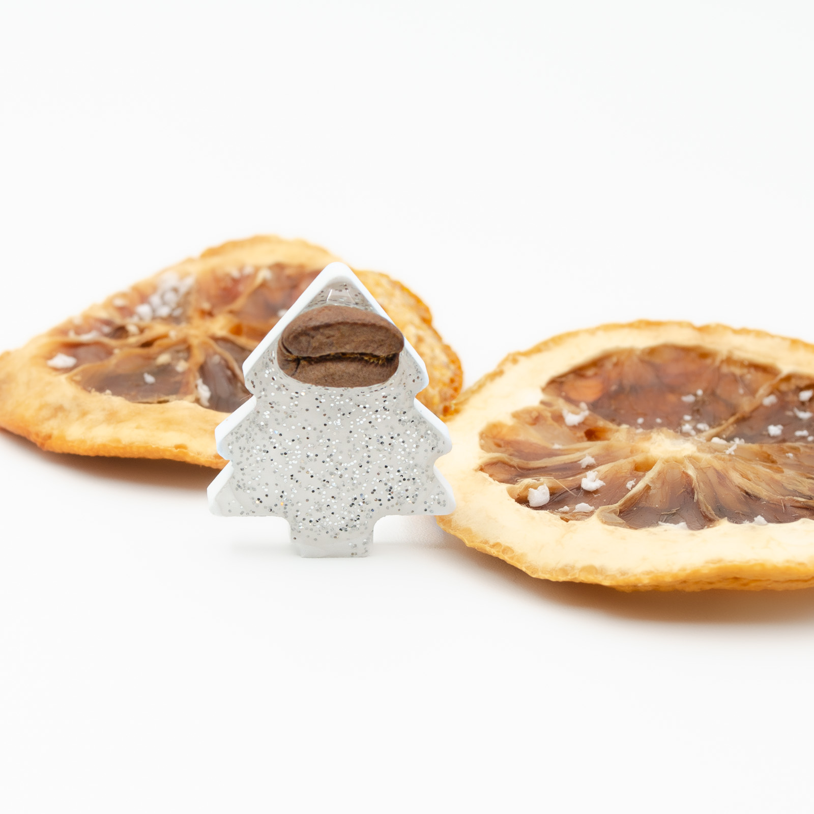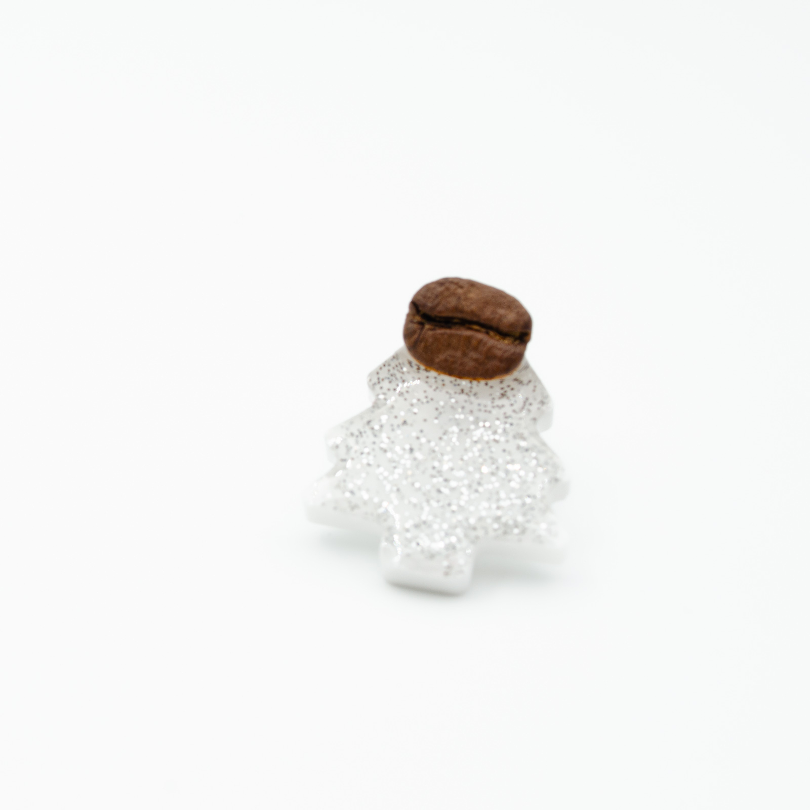 Broșa „SnowBrew” surprinde exact liniștea iernii: brăduț alb-argintiu, acoperit cu glitter rece și un bob de cafea real care încălzește designul cu o notă neașteptată. Are un look curat, modern, aproape „frosty”, ideal pentru ținutele de iarnă care vor un detaliu mic, dar memorabil.