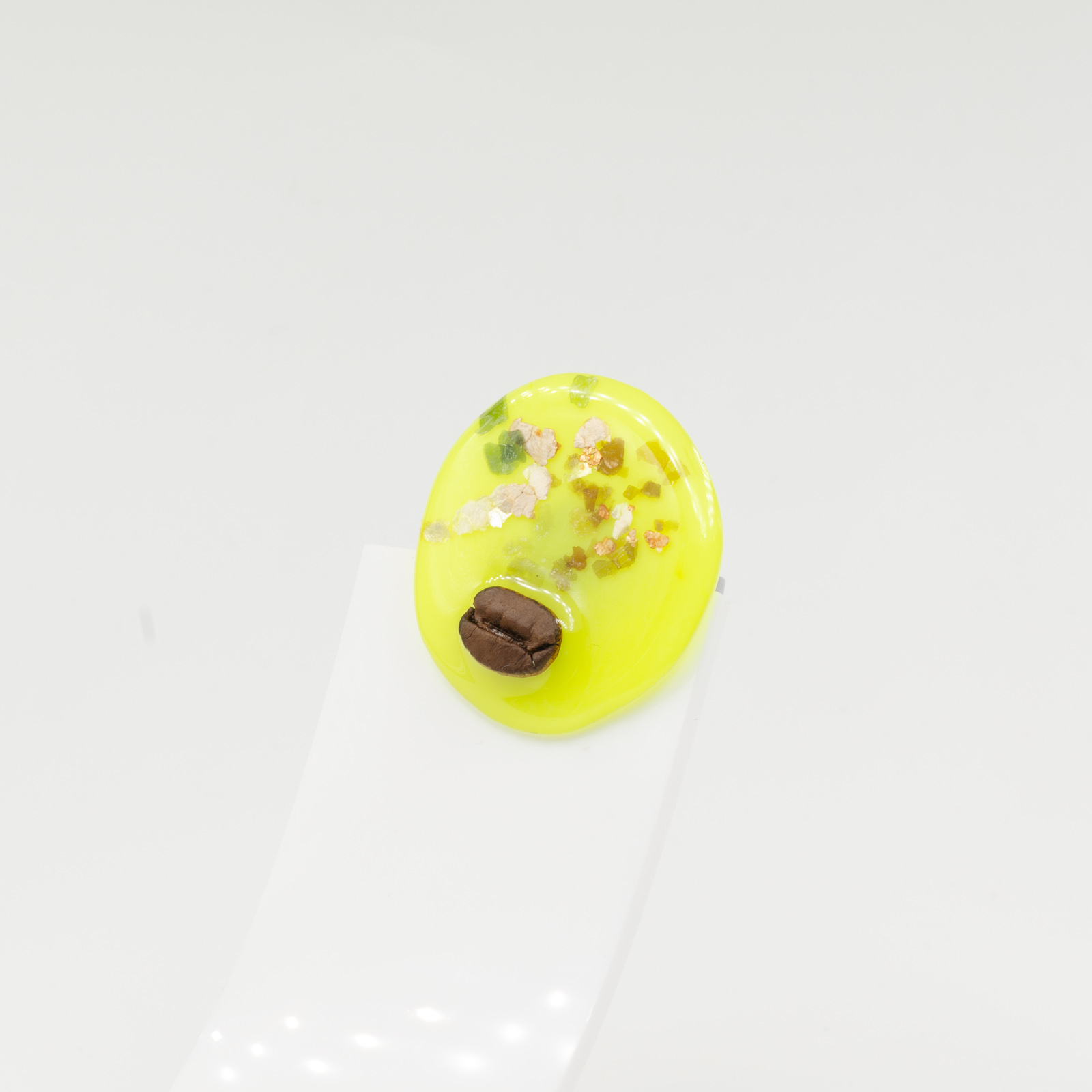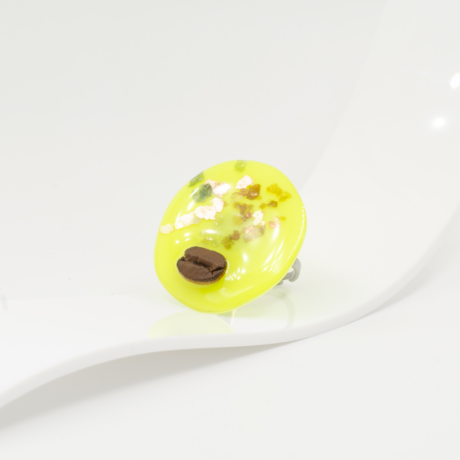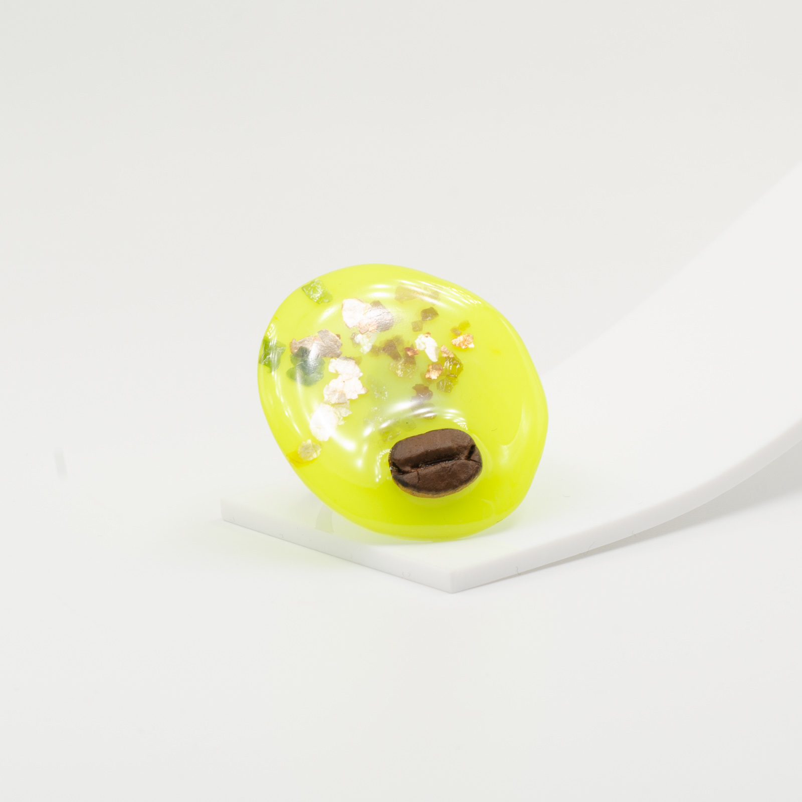 Inelul NEON METALLICA nu respectă reguli - le rescrie. Creat prin turnare liberă, fără matriță, cu o formă asimetrică și organică, fiecare piesă are propria personalitate, ca un riff de chitară pe care nu-l uiți. În centrul compoziției: un bob autentic de cafea. În jurul lui - o explozie de galben neon, străbătută de incluziuni de fulgi din șase metale diferite.