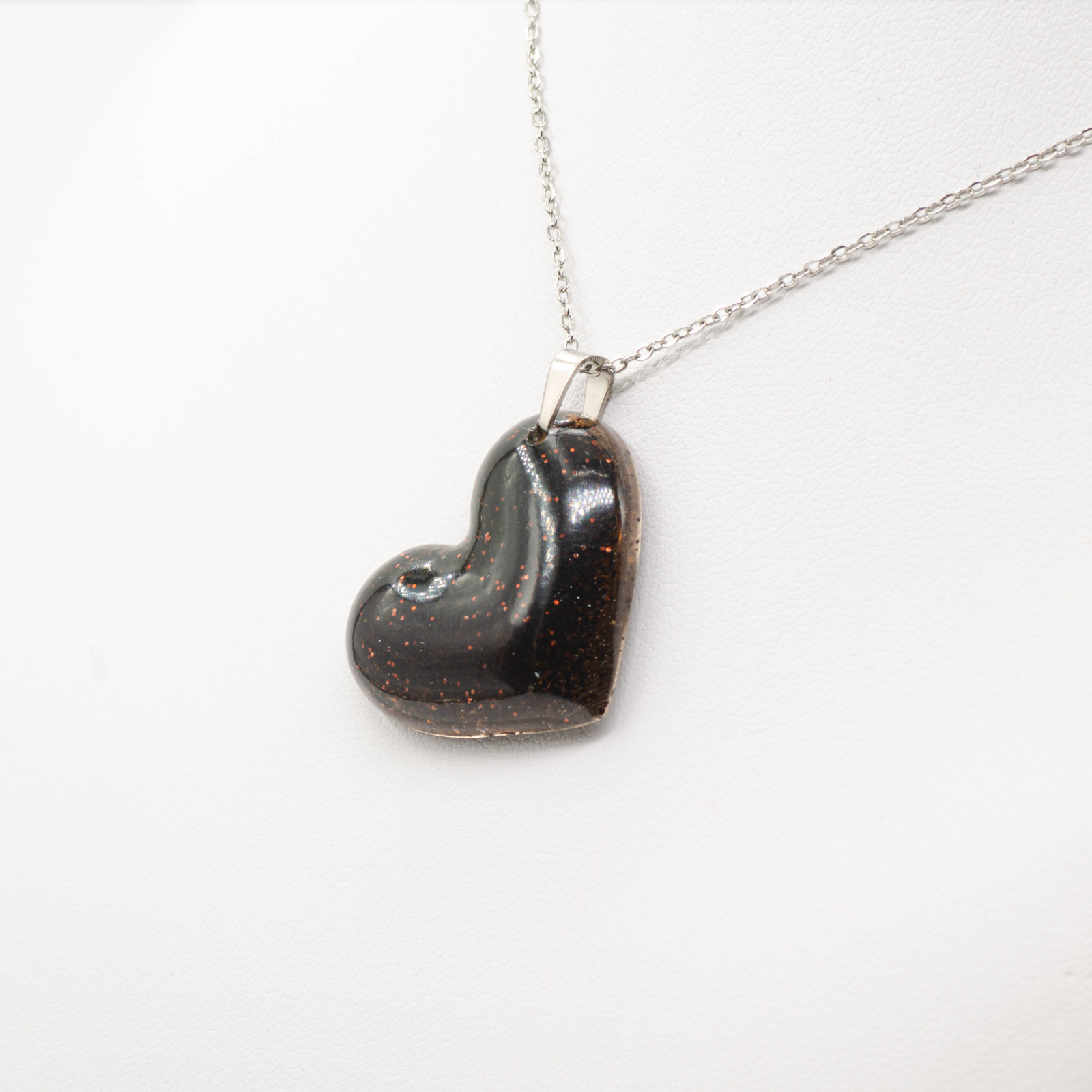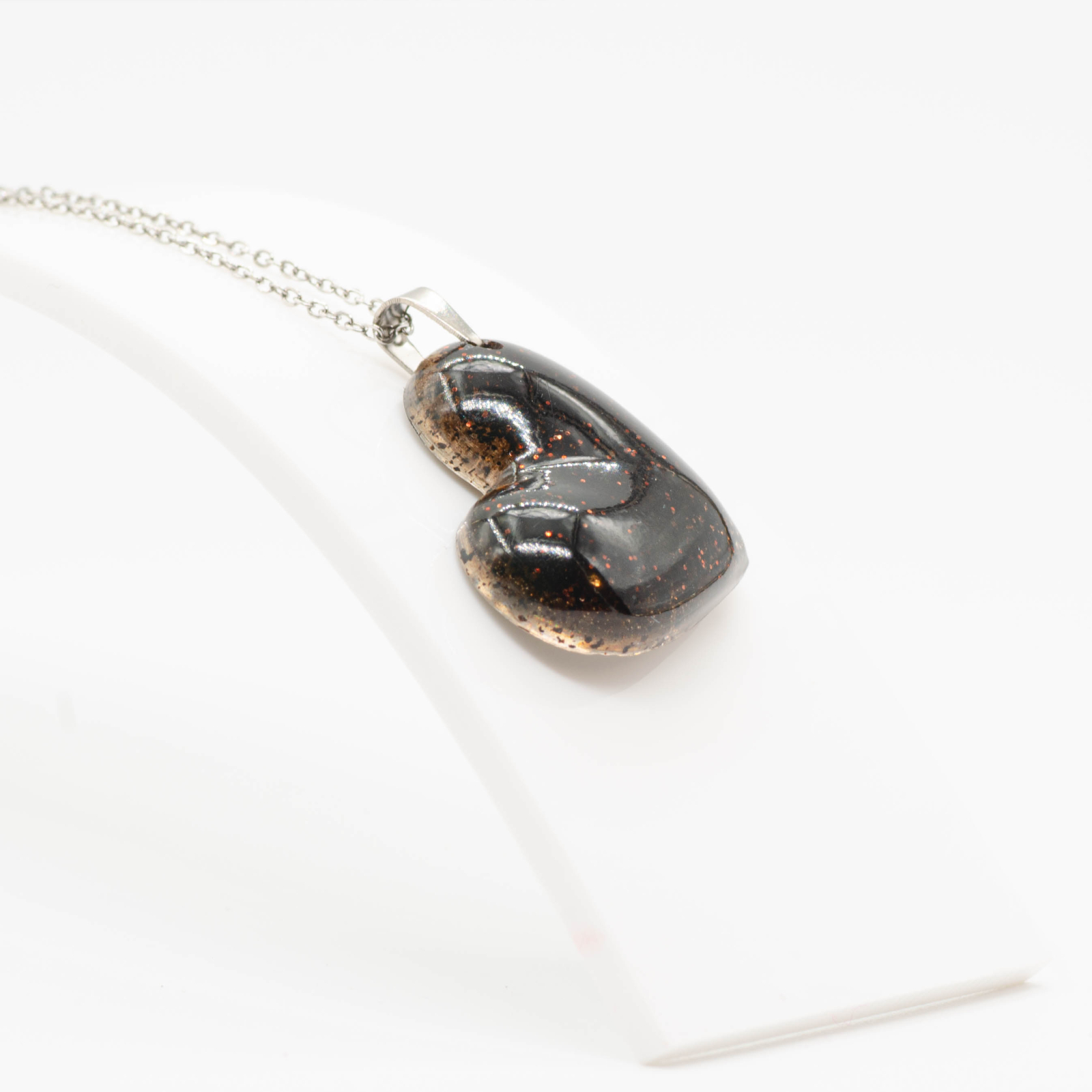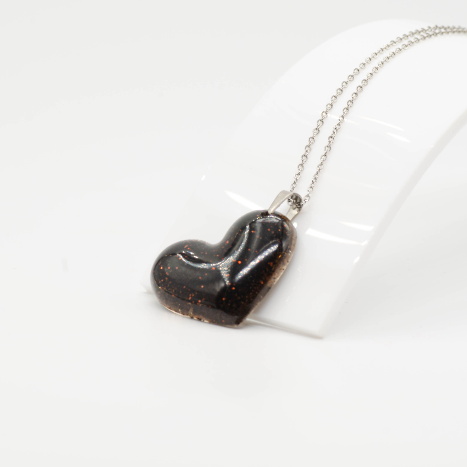 Inimă medie, intensă, fundal transparent, lucrată cu incluziuni dense de zaț de cafea și un strop de glitter crom care dă un aer prețios, darfix cât trebuie. Mood dark, cu un twist subtil de strălucire, pentru momentele în care cafeaua și emoțiile se iau în serios.