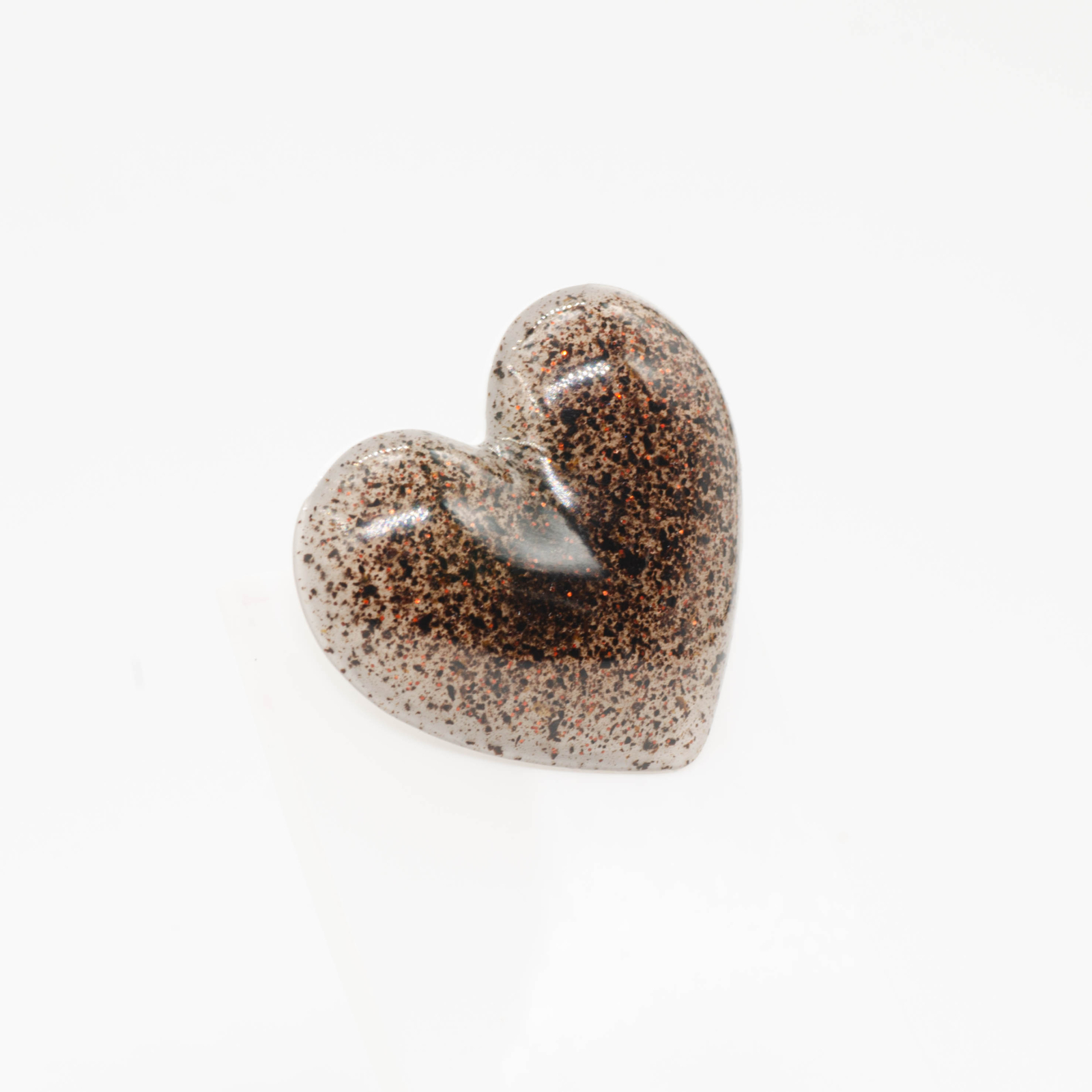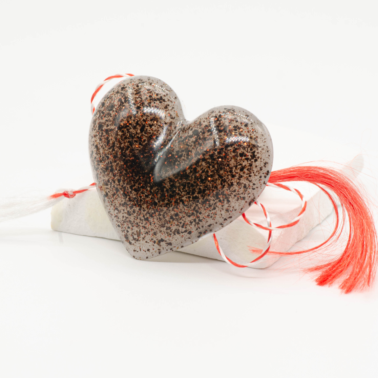 Inimă mare, luminoasă, lucrată pe fundal alb curat, cu incluziuni de zaț de cafea în densitate medie, pentru un contrast natural între textura cafelei și suprafața clară care scoate totul în evidență. Un strop subtil de glitter crom adaugă acel twist discret prețios, exact cât să prindă lumina.