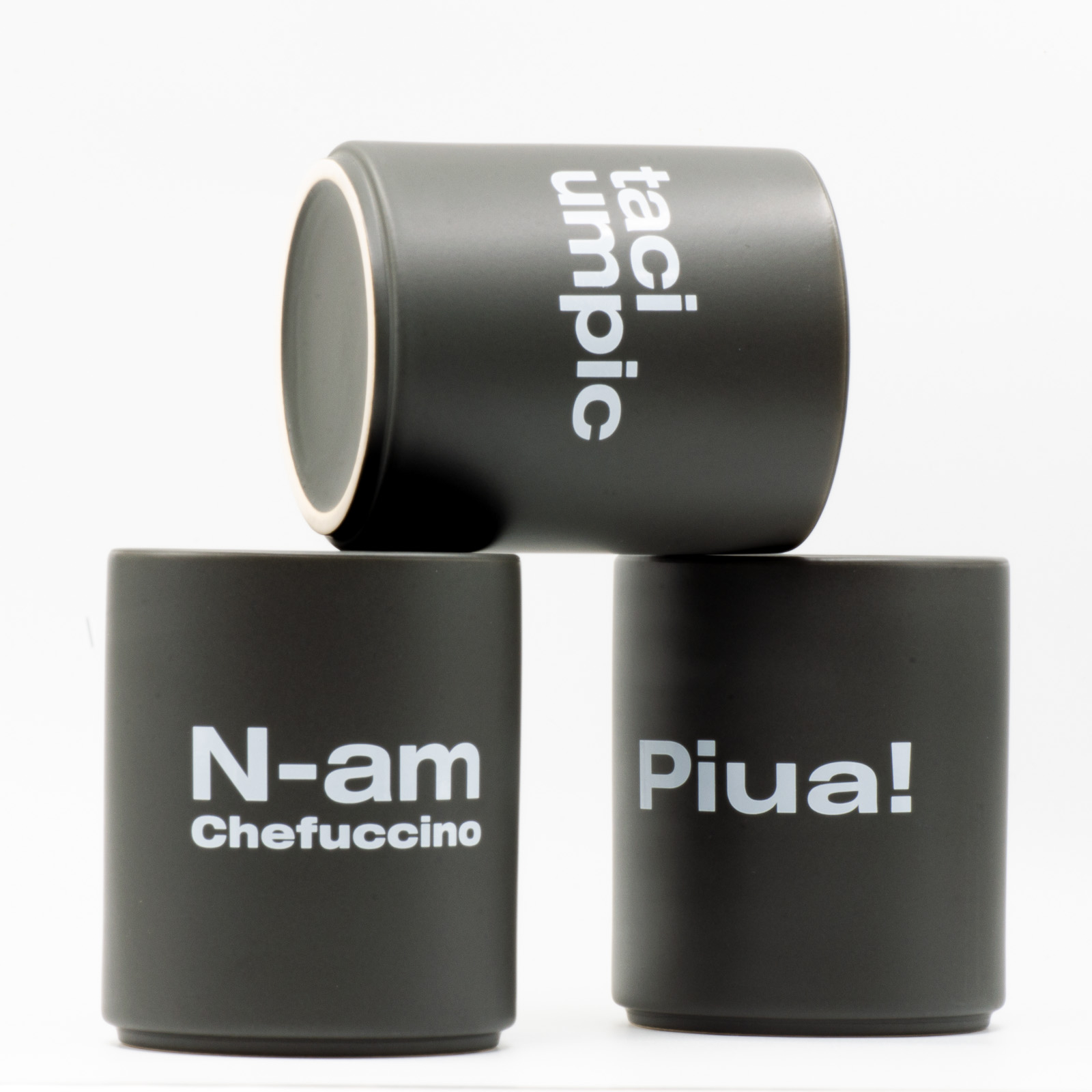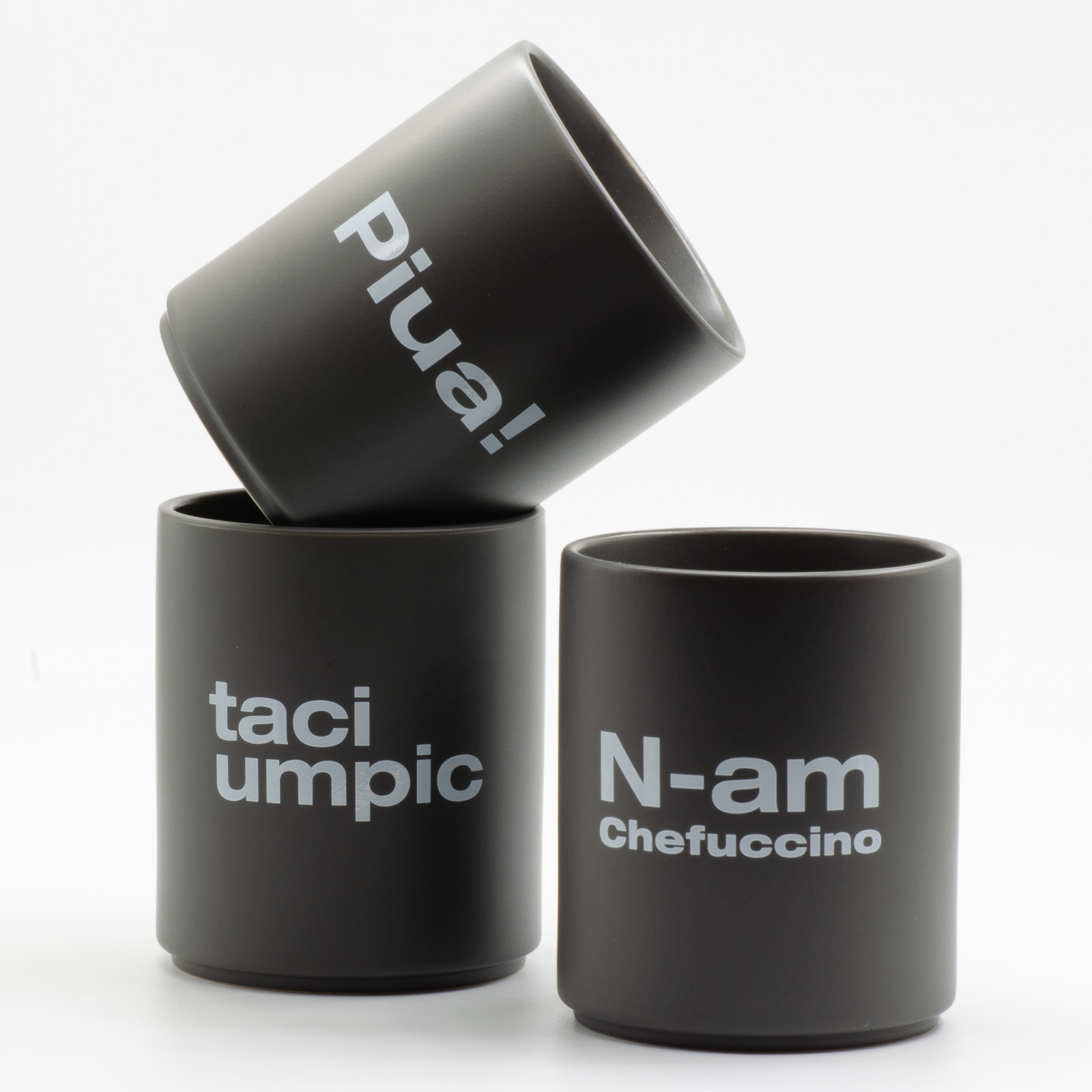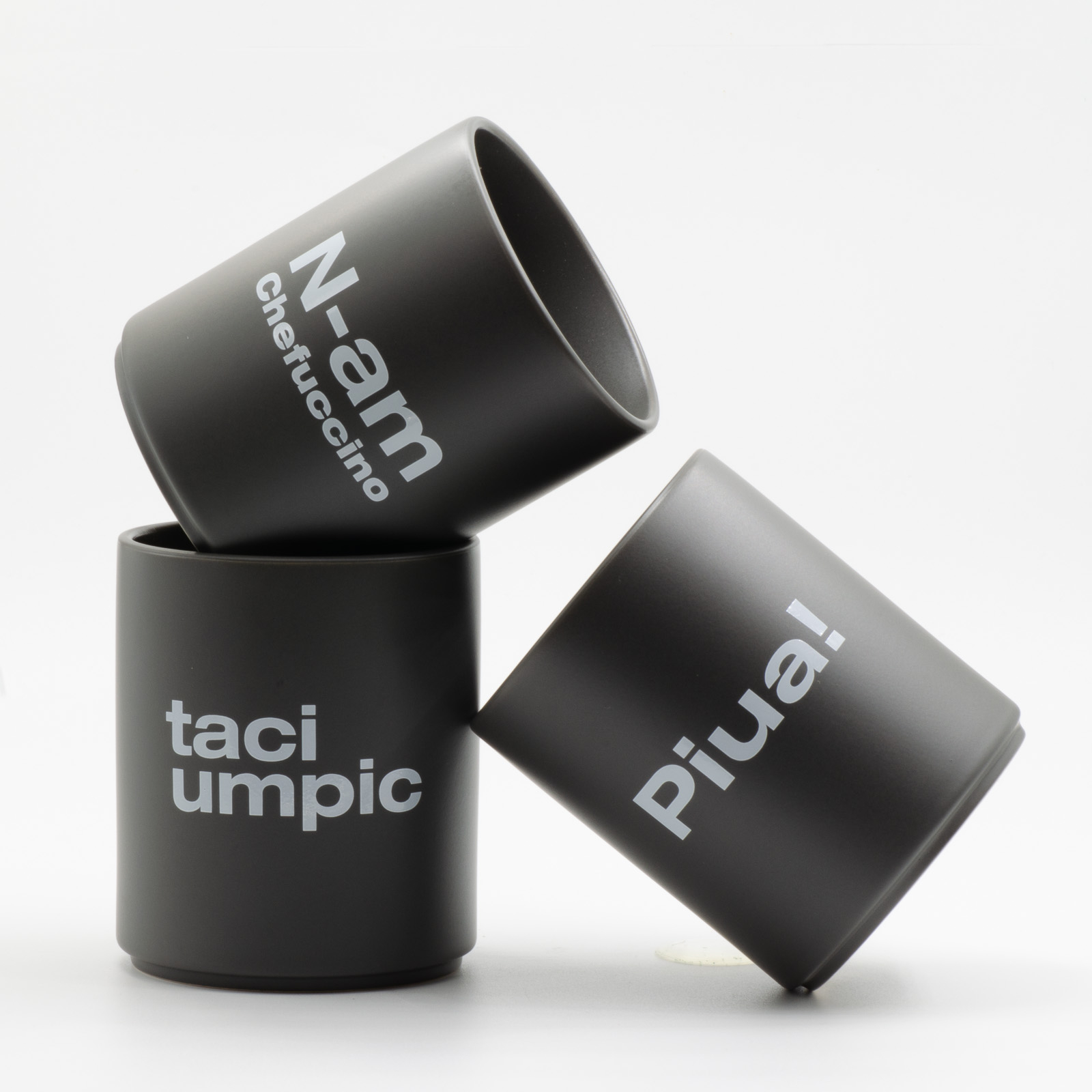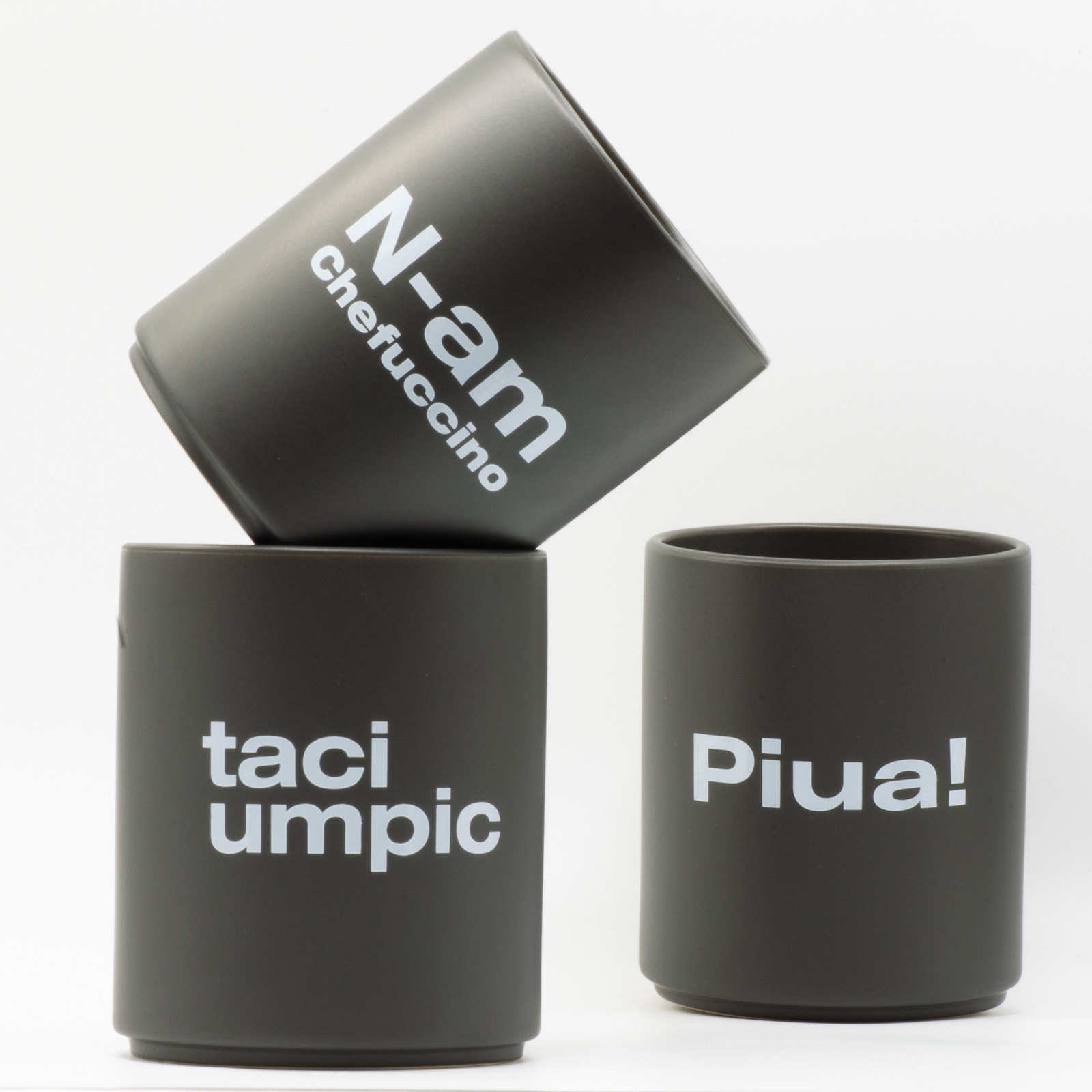 Cănile sunt din ceramică mată, fără toartă, cu text alb pe gri - curate, tactile, cu atitudine. Fiecare are 240 ml și un vibe diferit, iar împreună acoperă tot spectrul stărilor de zi cu zi.
