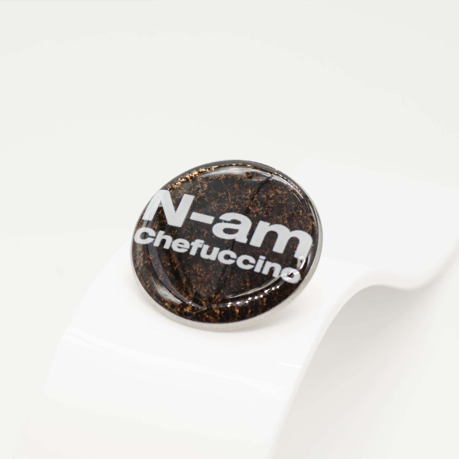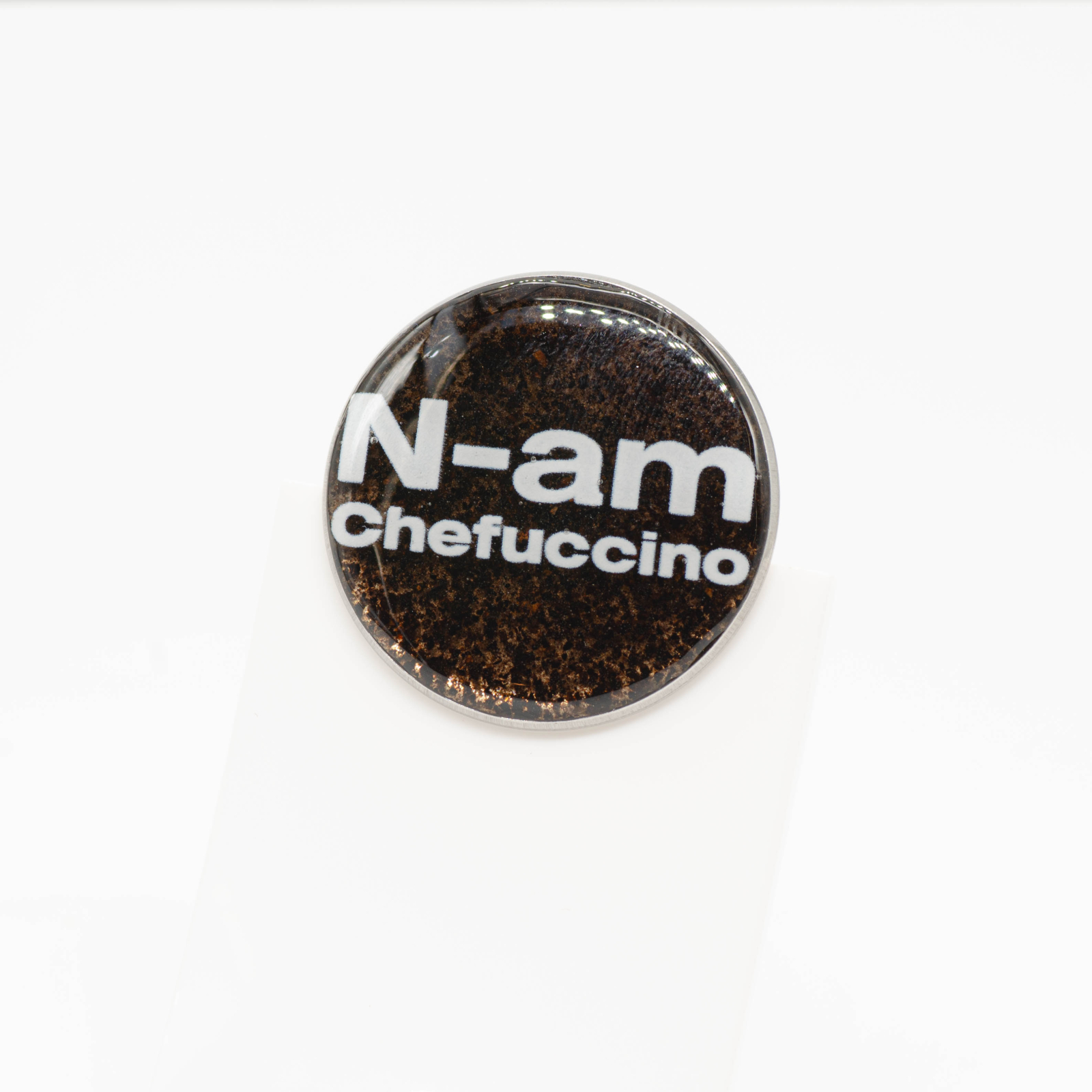 Pin rotund, cu mesajul „N-am chefuccino” scris alb peste un fundal lucrat din zaț de cafea şi rășină. Textura de zaț rămâne vizibilă și păstrează nota naturală, recognoscibilă pentru BeanBling: e un mesaj simpatic într-un mic univers de cafea la purtător.