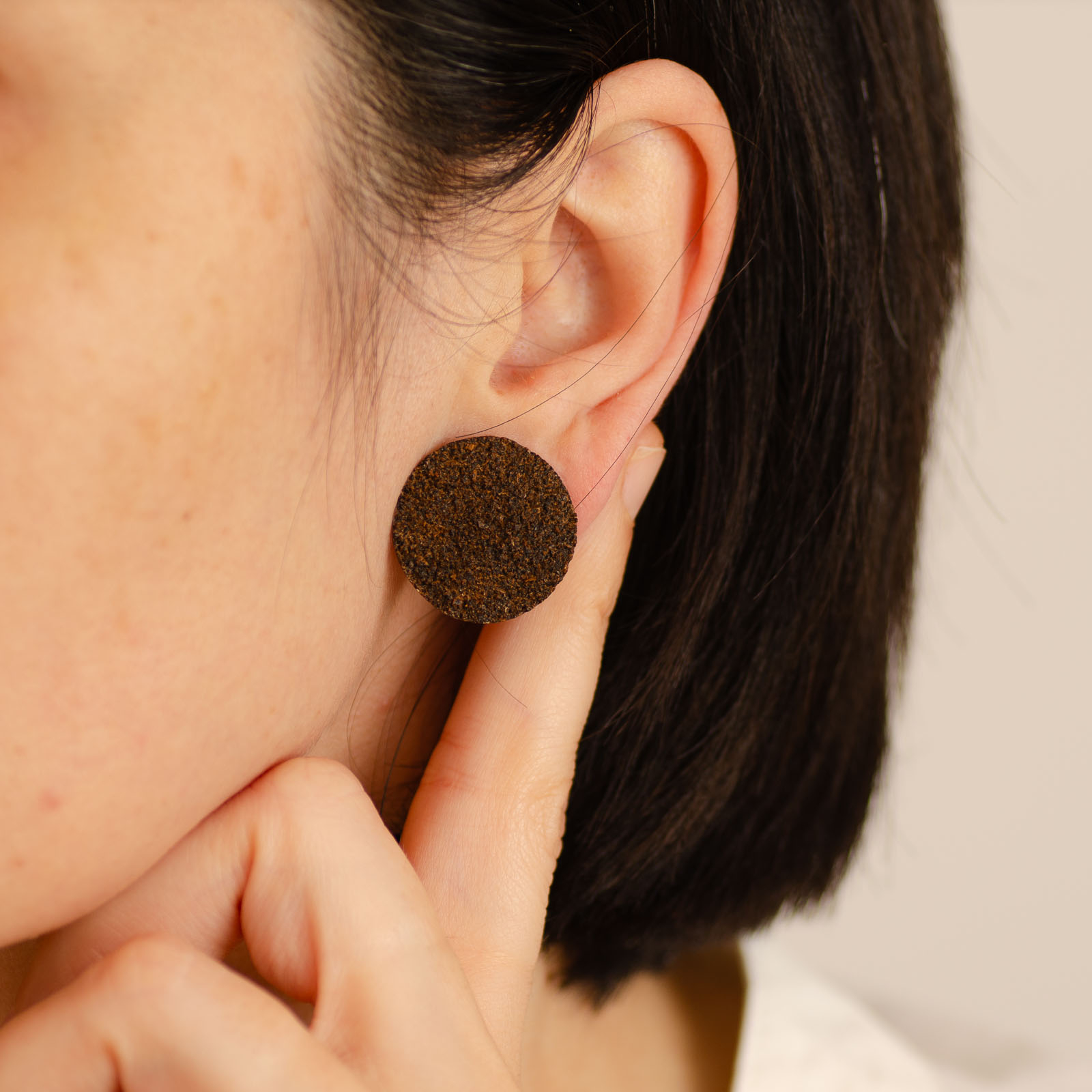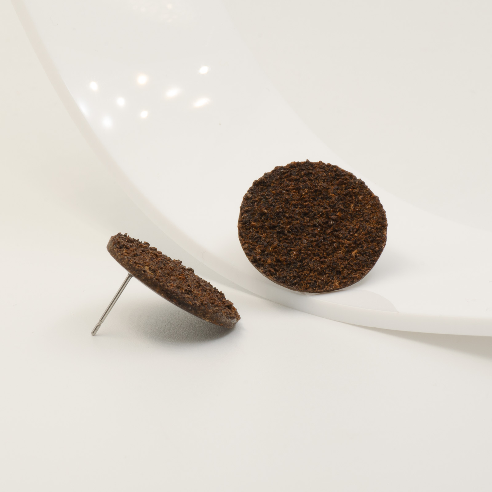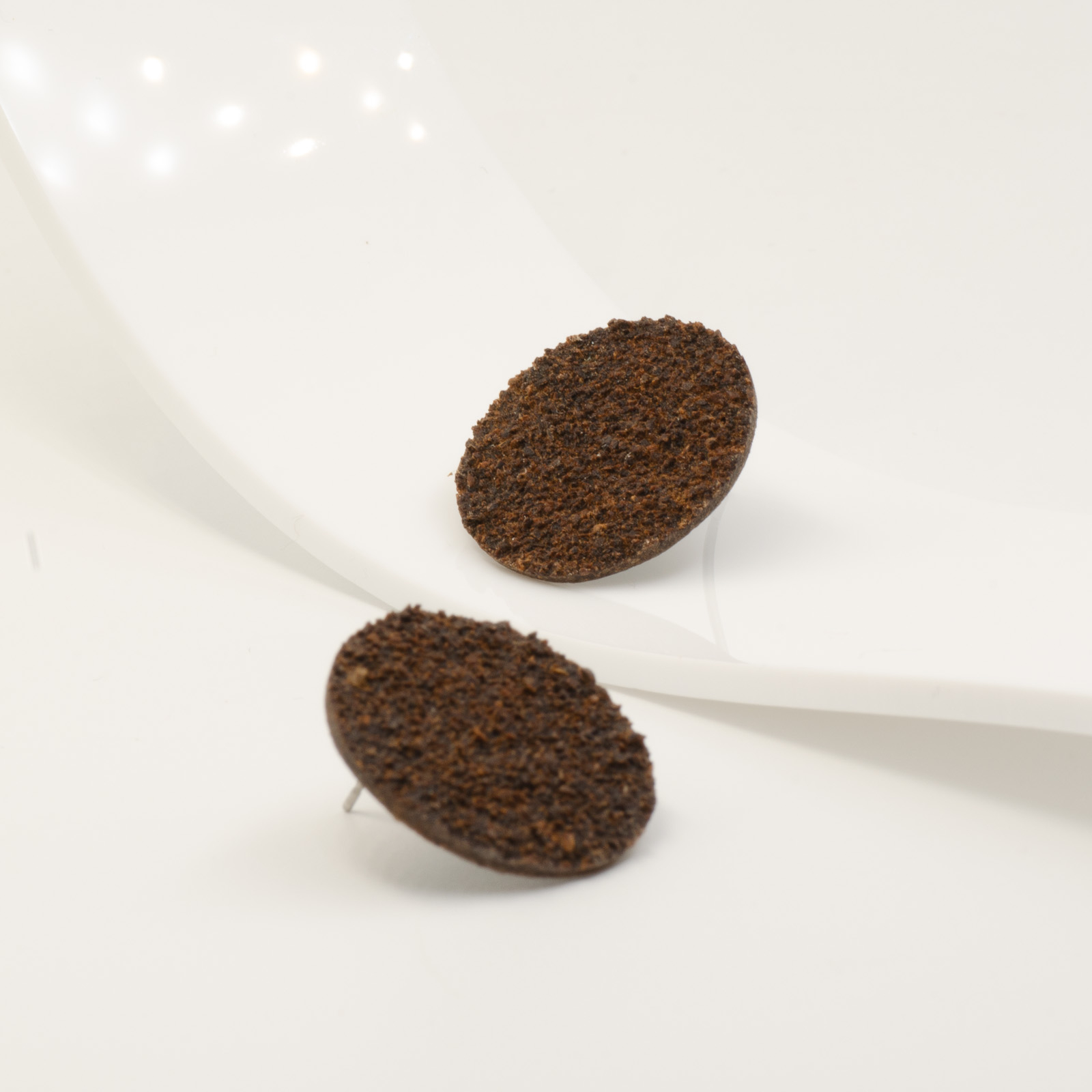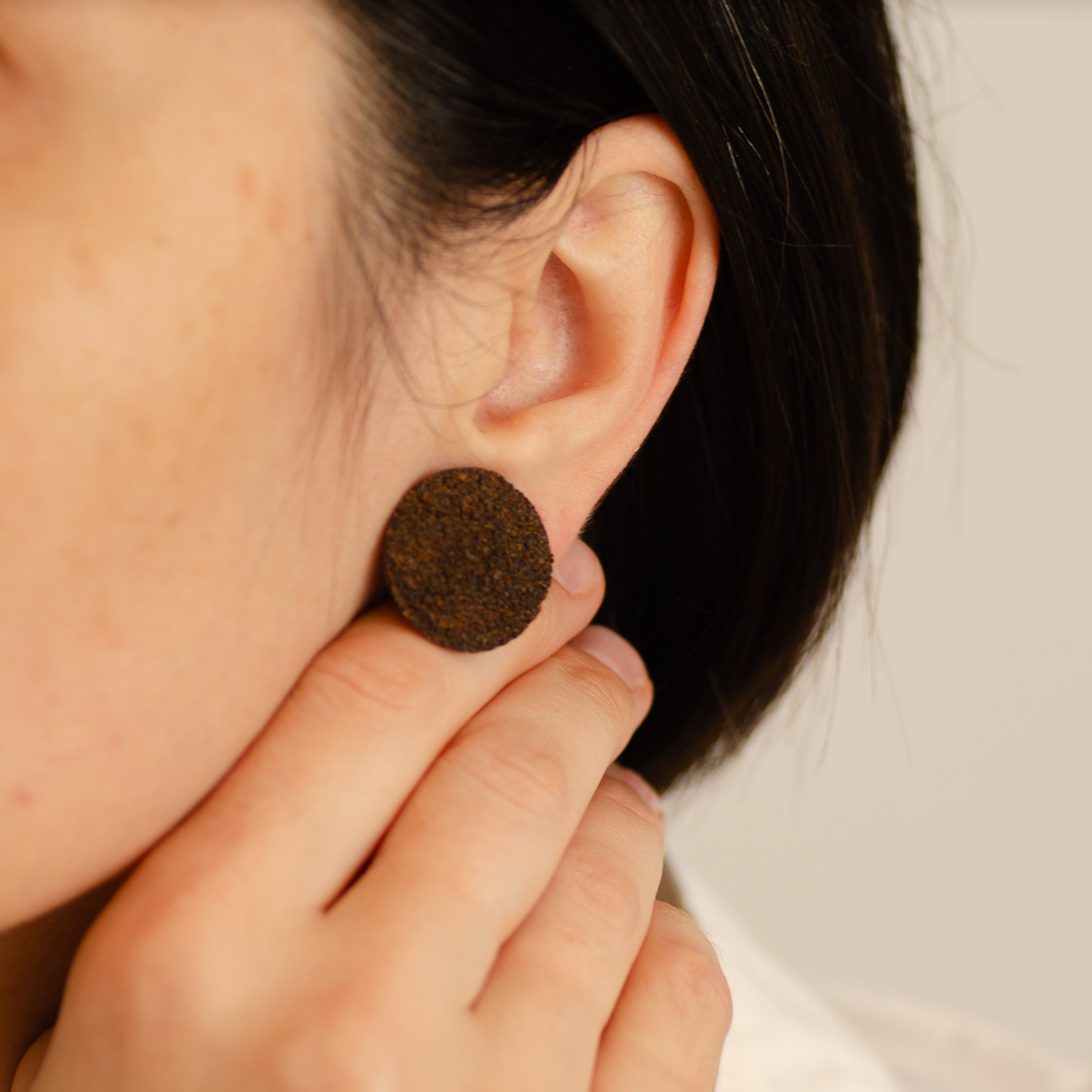 Toți cerceii BeanBling sunt realizați manual în România, din zaț de cafea reciclat, presărat în mai multe etape și sigilat în rășină, apoi combinat cu elemente din oțel inoxidabil 316L – un material hipoalergenic, rezistent la apă și uzură.