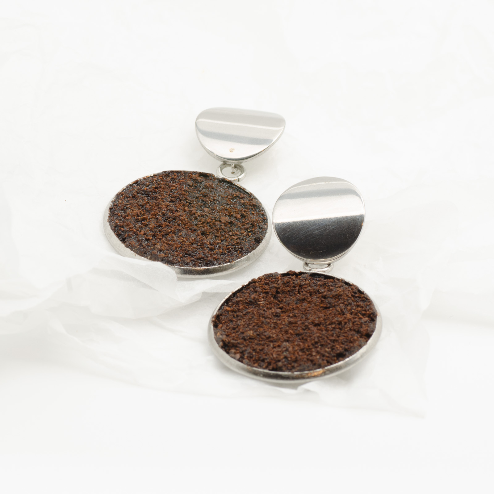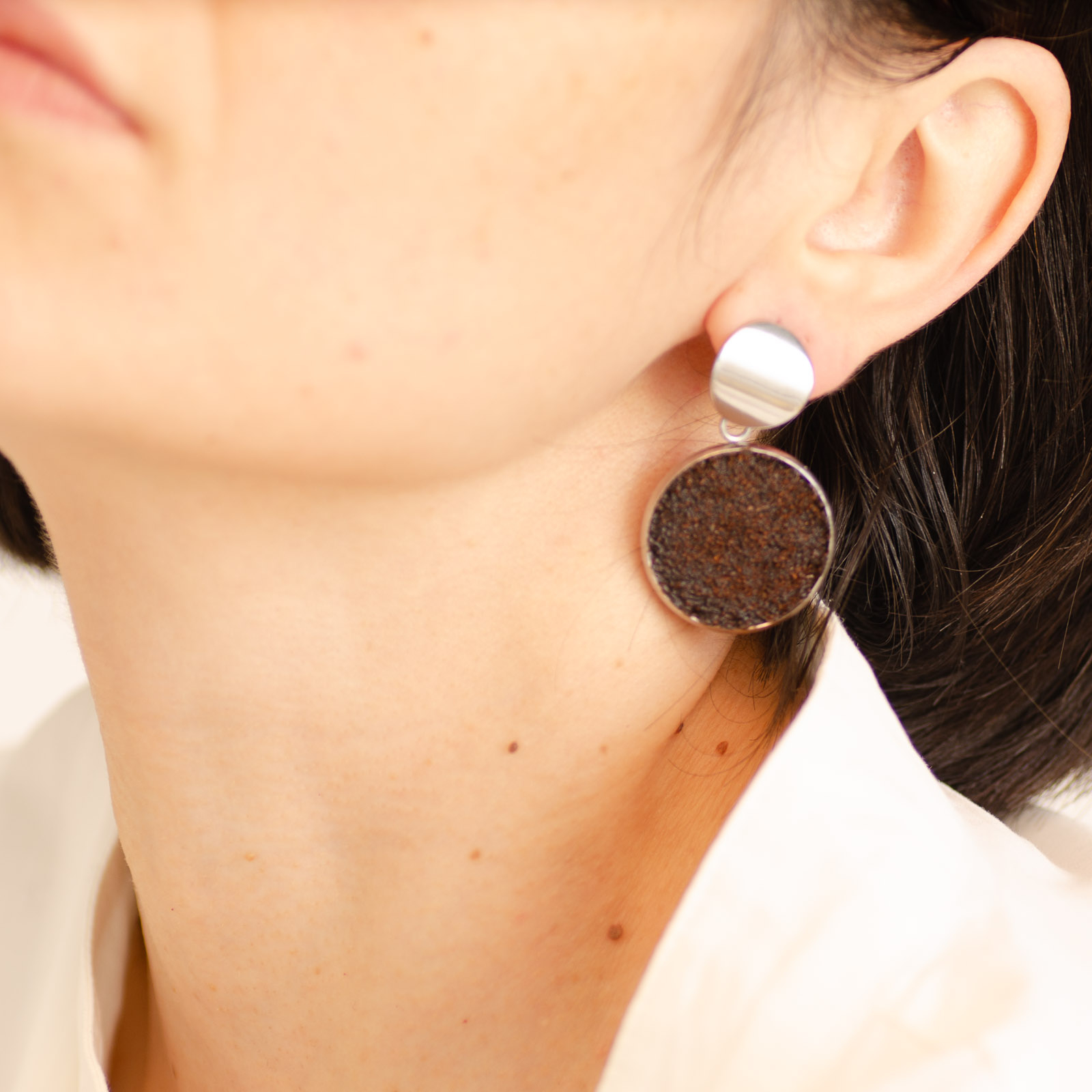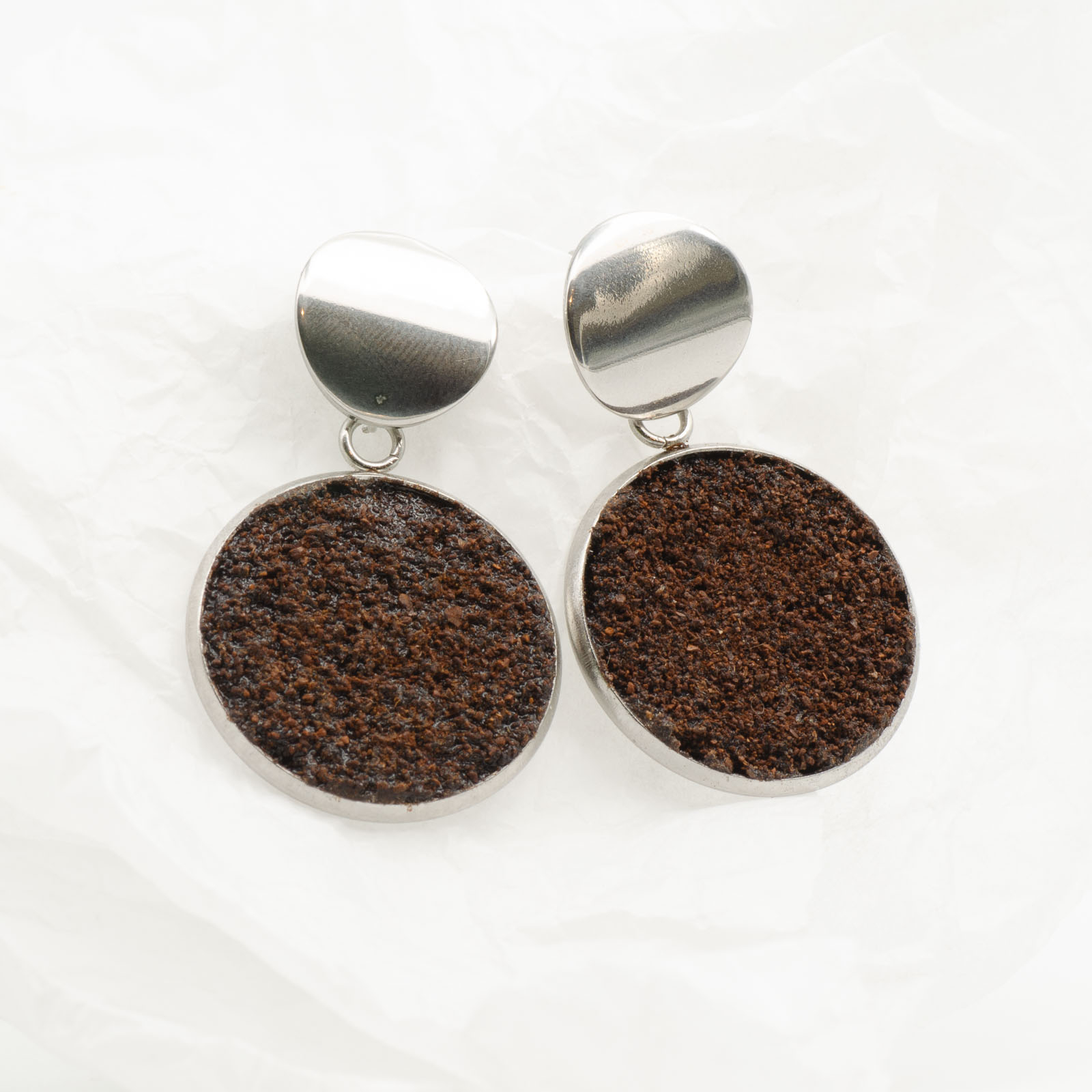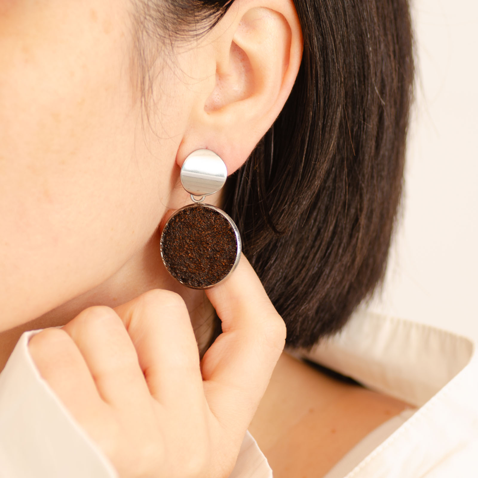 Toți cerceii BeanBling sunt realizați manual în România, din zaț de cafea reciclat, presărat în mai multe etape și sigilat în rășină, apoi combinat cu elemente din oțel inoxidabil 316L – un material hipoalergenic, rezistent la apă și uzură.