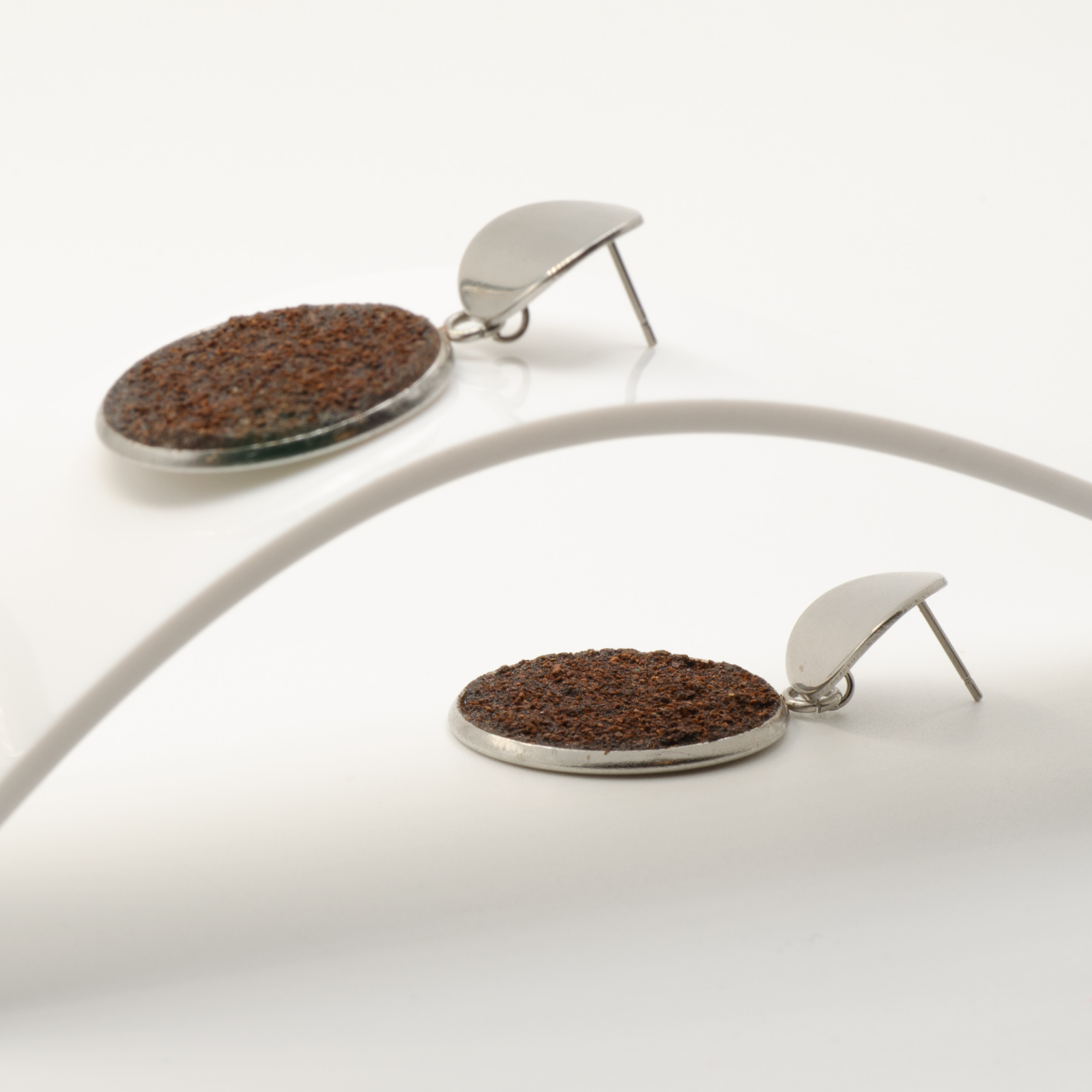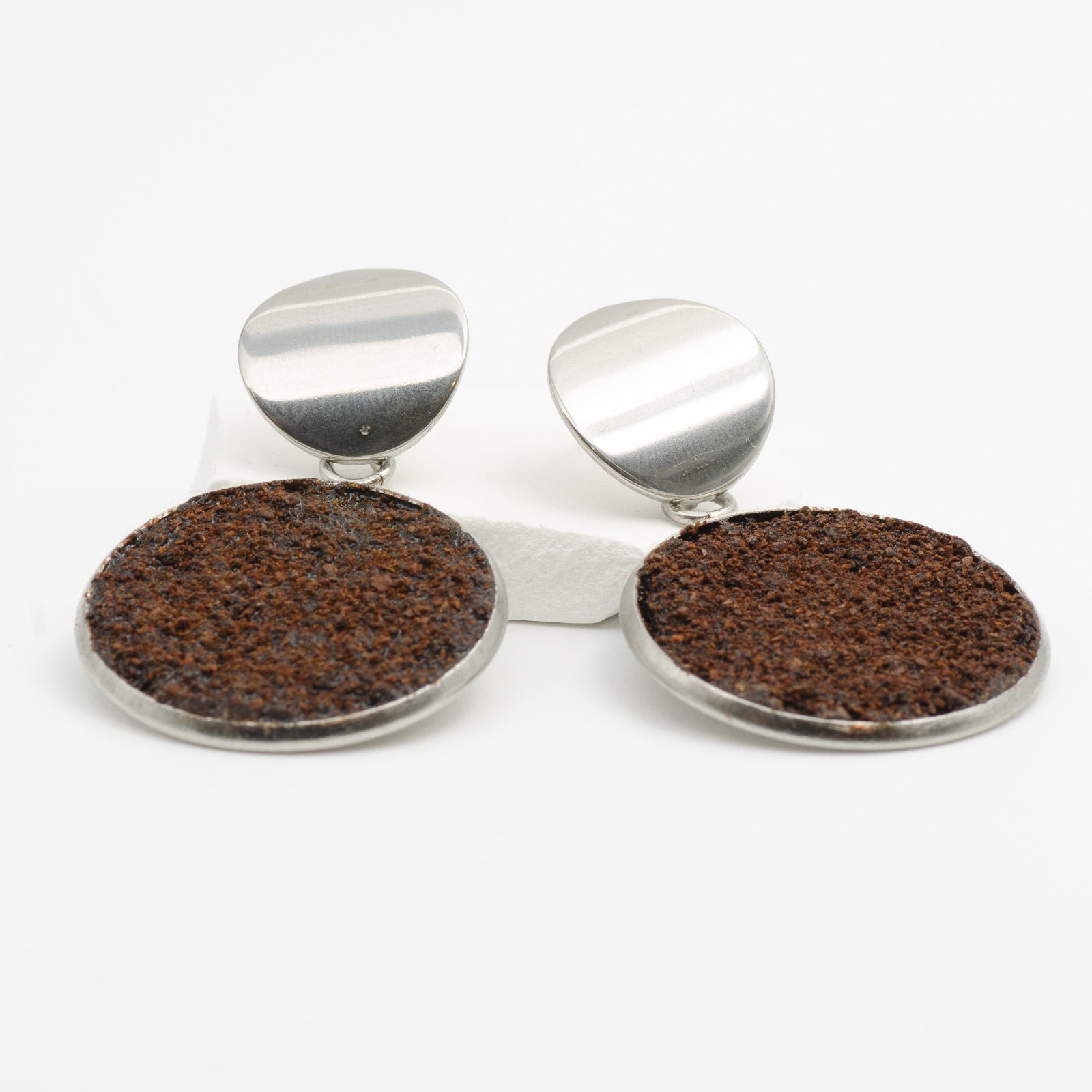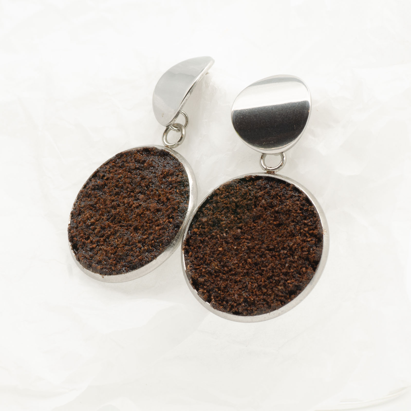 Toți cerceii BeanBling sunt realizați manual în România, din zaț de cafea reciclat, presărat în mai multe etape și sigilat în rășină, apoi combinat cu elemente din oțel inoxidabil 316L – un material hipoalergenic, rezistent la apă și uzură.
