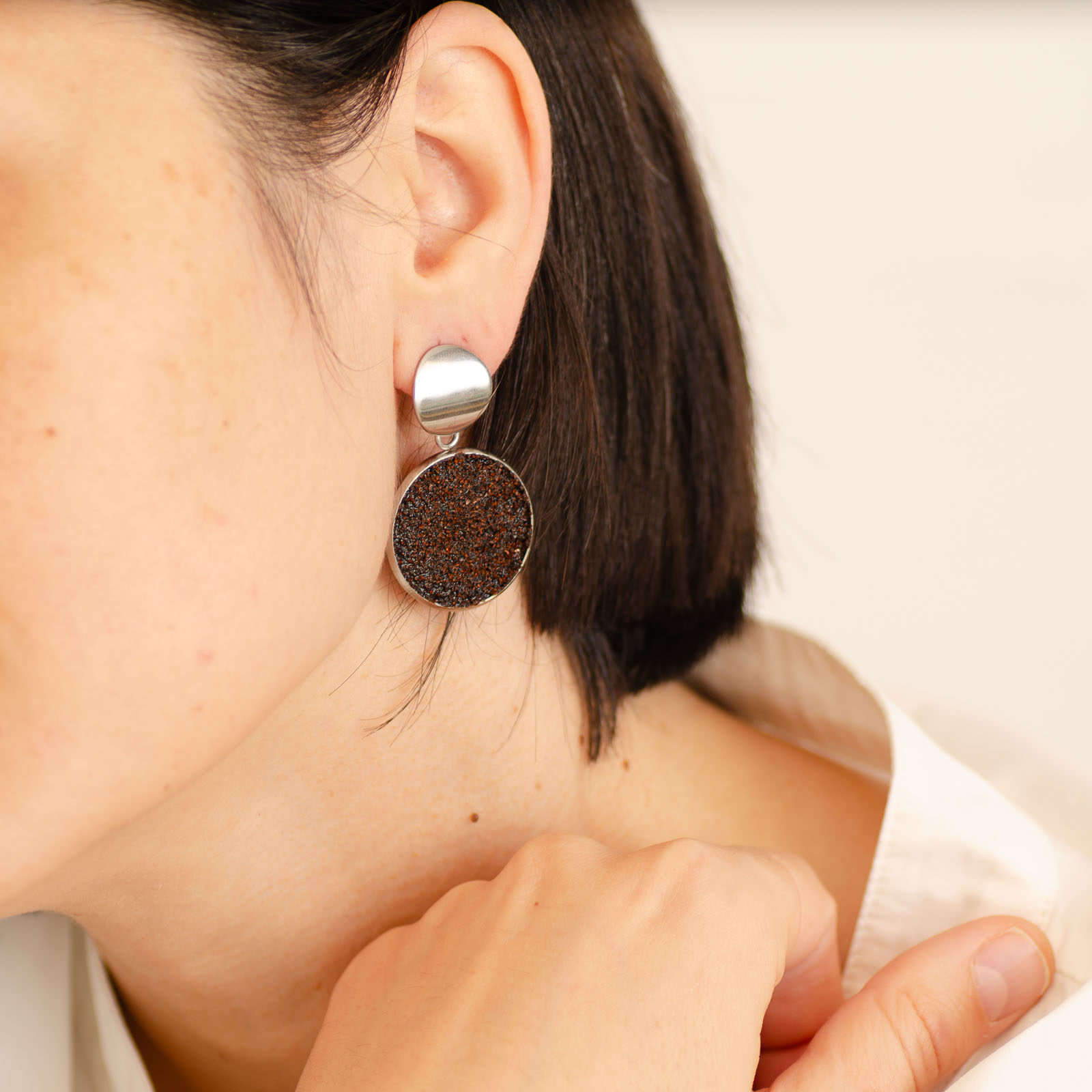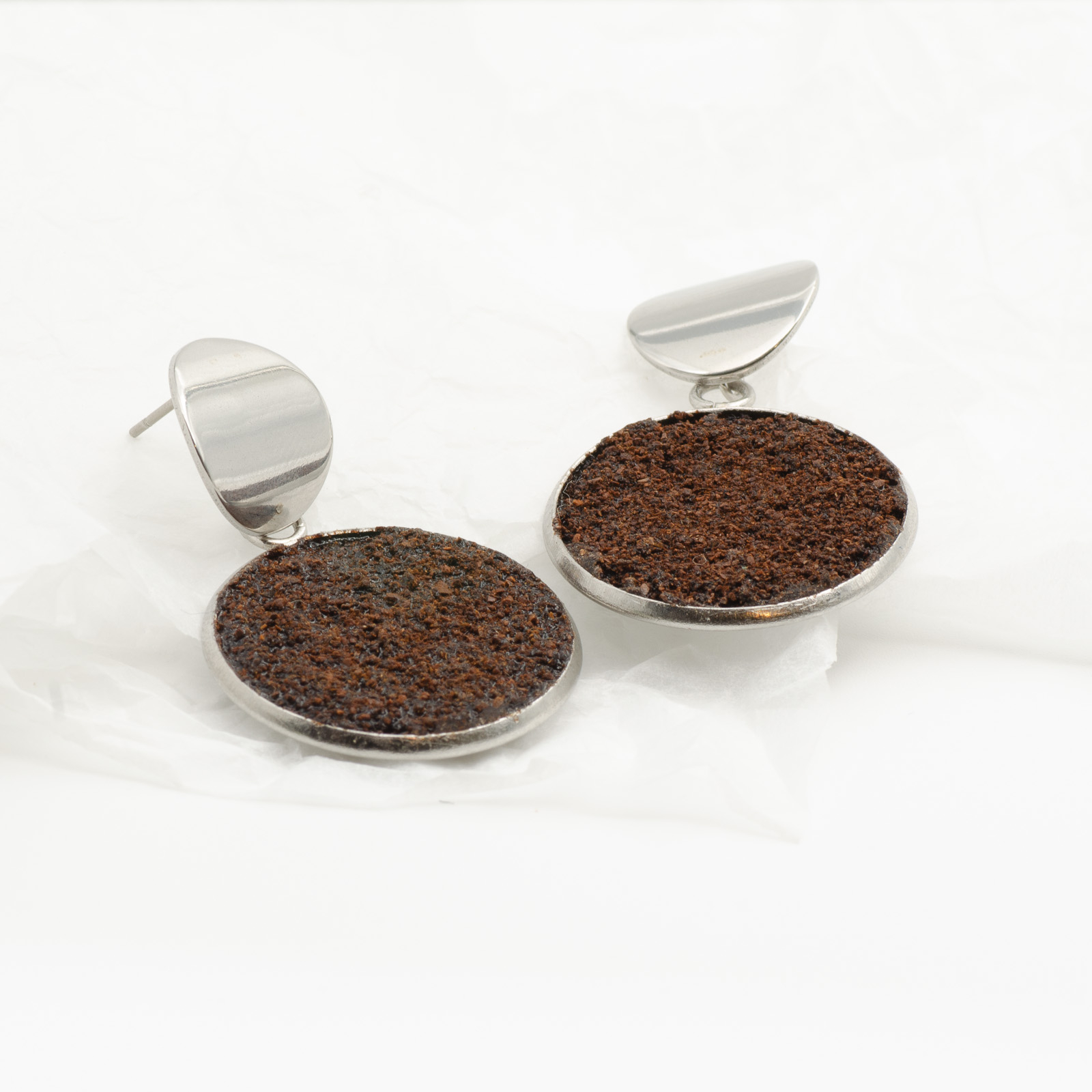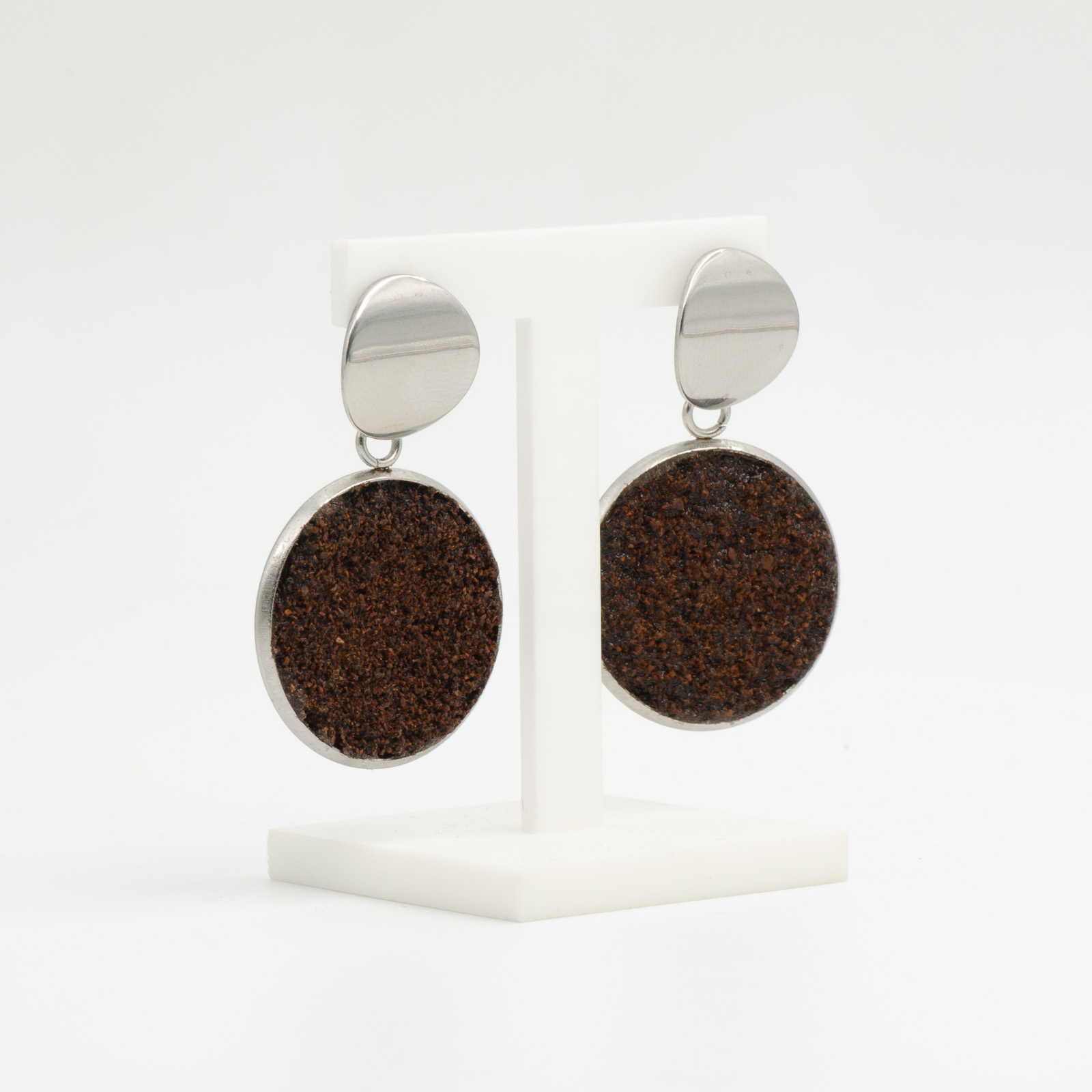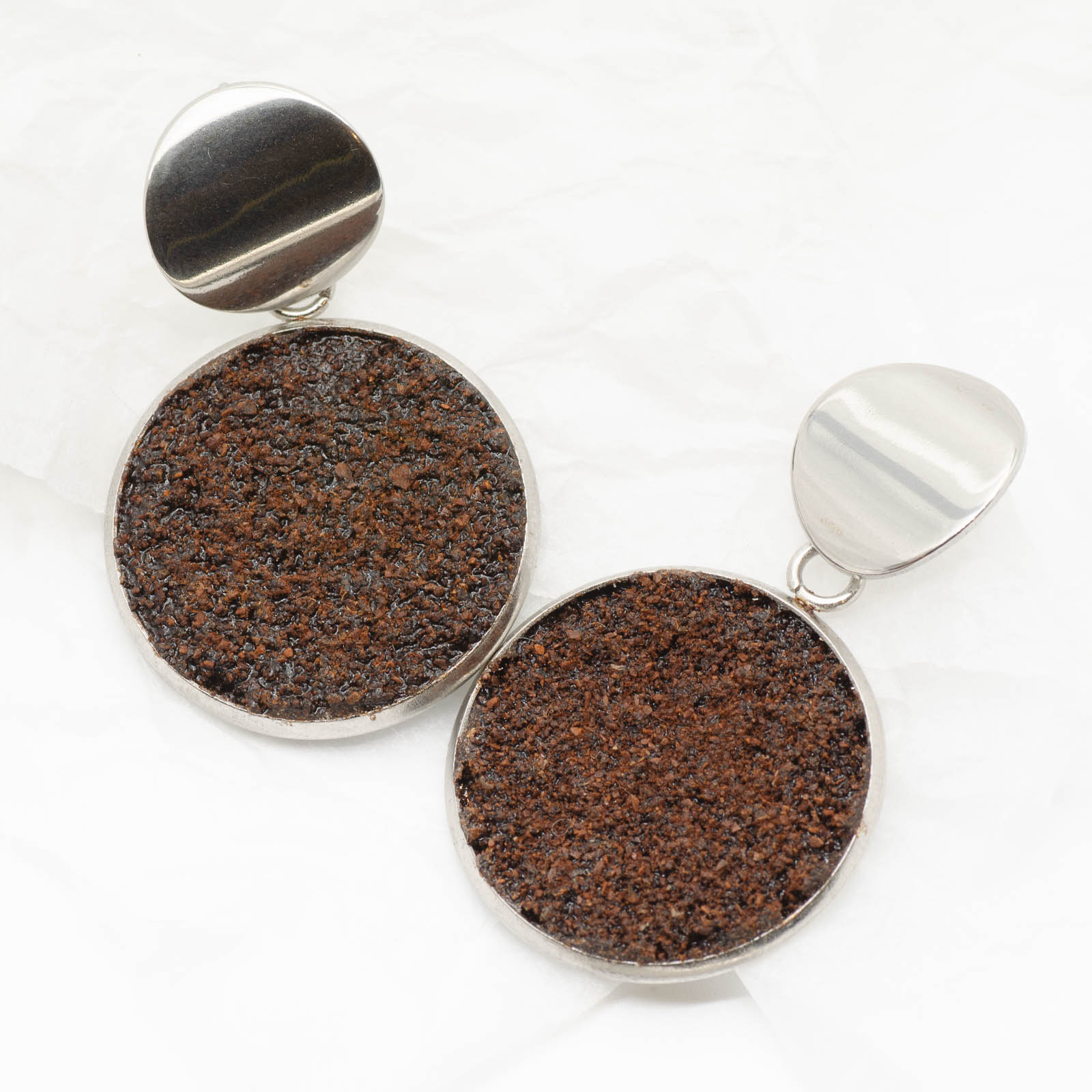 Toți cerceii BeanBling sunt realizați manual în România, din zaț de cafea reciclat, presărat în mai multe etape și sigilat în rășină, apoi combinat cu elemente din oțel inoxidabil 316L – un material hipoalergenic, rezistent la apă și uzură.