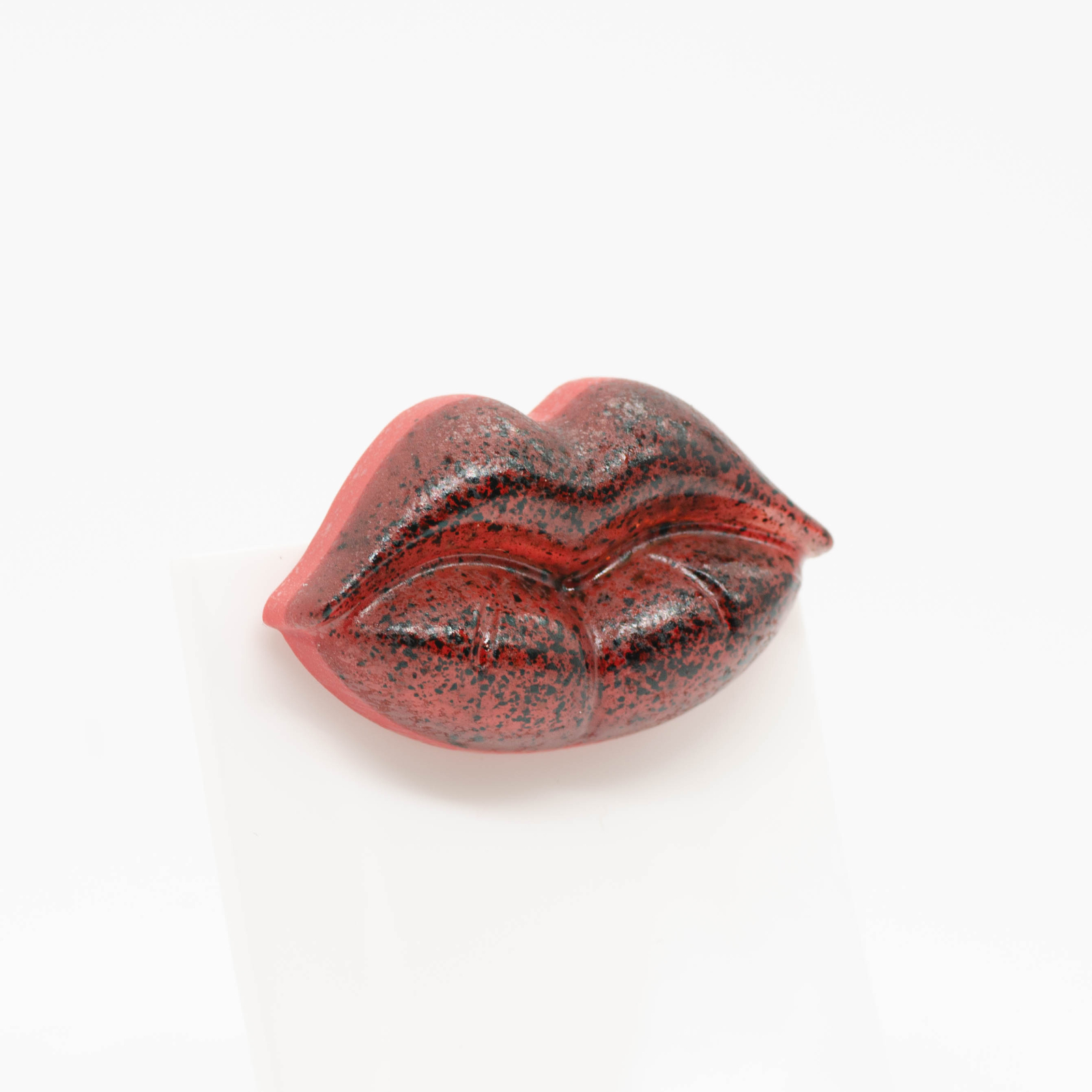 O broșă pin în formă de buze, cu fundal roșu și incluziuni de zaț de cafea real. PupiCinno Roșu este un accesoriu fun, ușor senzual și foarte ușor de remarcat, dar rămâne în același timp smart și purtabil, inclusiv în ținute de zi sau de birou.