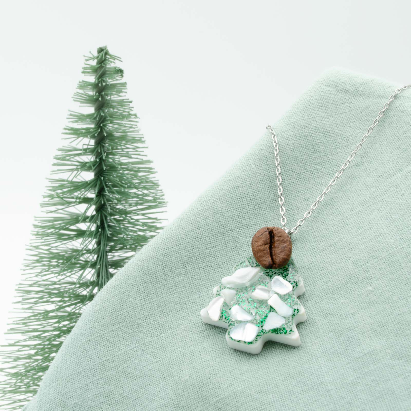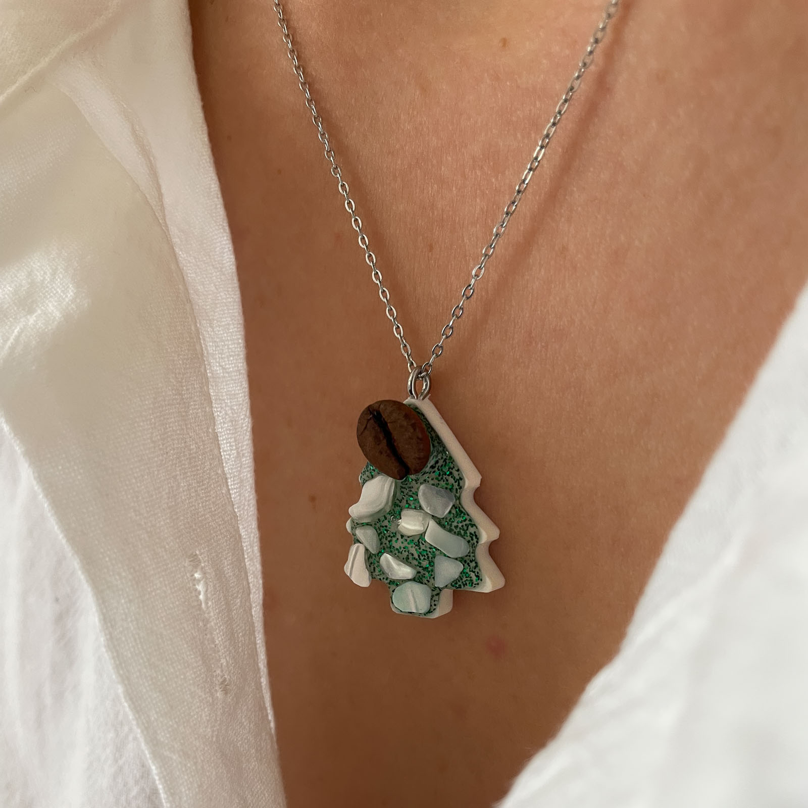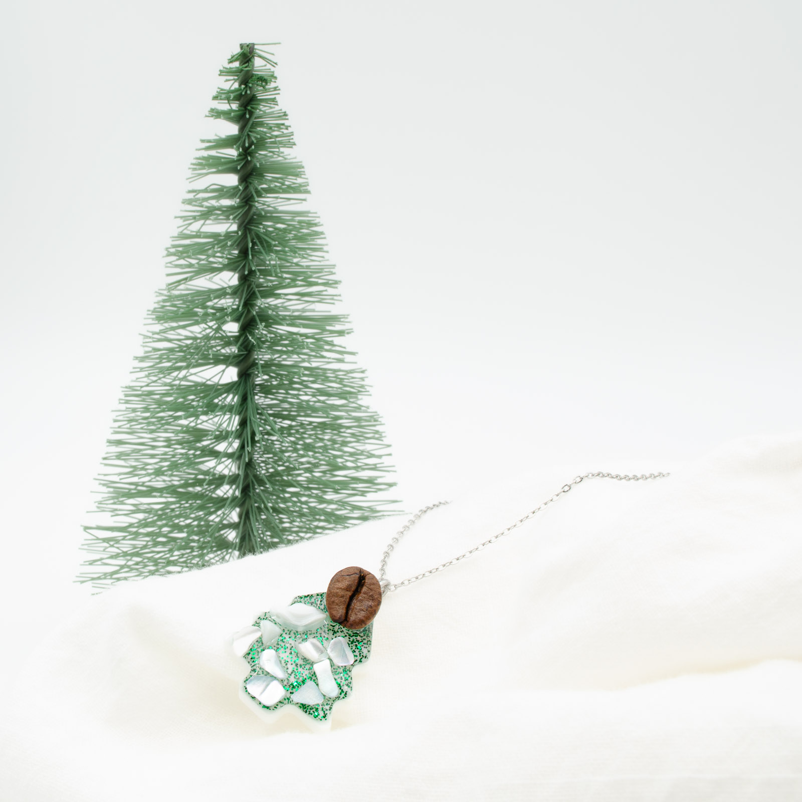 Colierul „ "Evergreen Shine"” combină spiritul Crăciunului cu detalii aproape magice: un brăduț verde cu glitter fin, presărat cu mici bucăți de scoică albă care prind lumina ca niște perle, iar în vârf - un bob de cafea real, cald și familiar. E o piesă cu texturi bogate și un aer de poveste, care aduce un strop de strălucire discretă în orice ținută de iarnă.