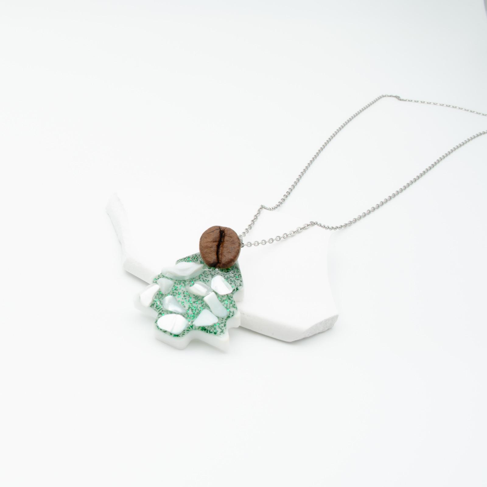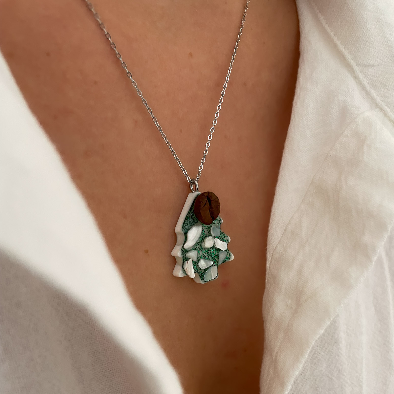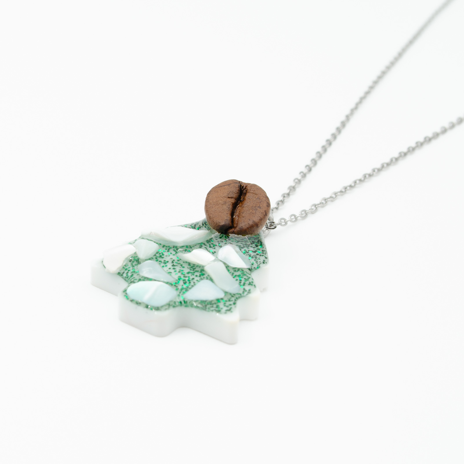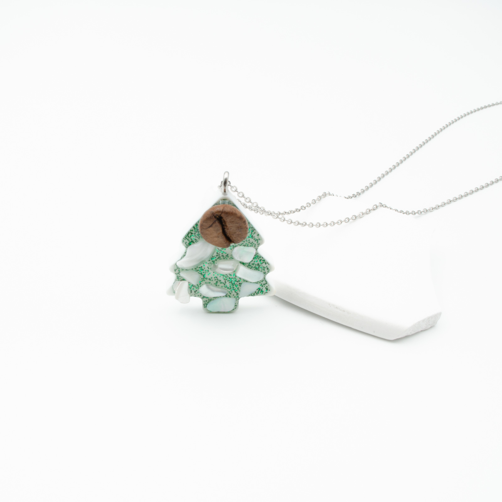 Colierul „ "Evergreen Shine"” combină spiritul Crăciunului cu detalii aproape magice: un brăduț verde cu glitter fin, presărat cu mici bucăți de scoică albă care prind lumina ca niște perle, iar în vârf - un bob de cafea real, cald și familiar. E o piesă cu texturi bogate și un aer de poveste, care aduce un strop de strălucire discretă în orice ținută de iarnă.
