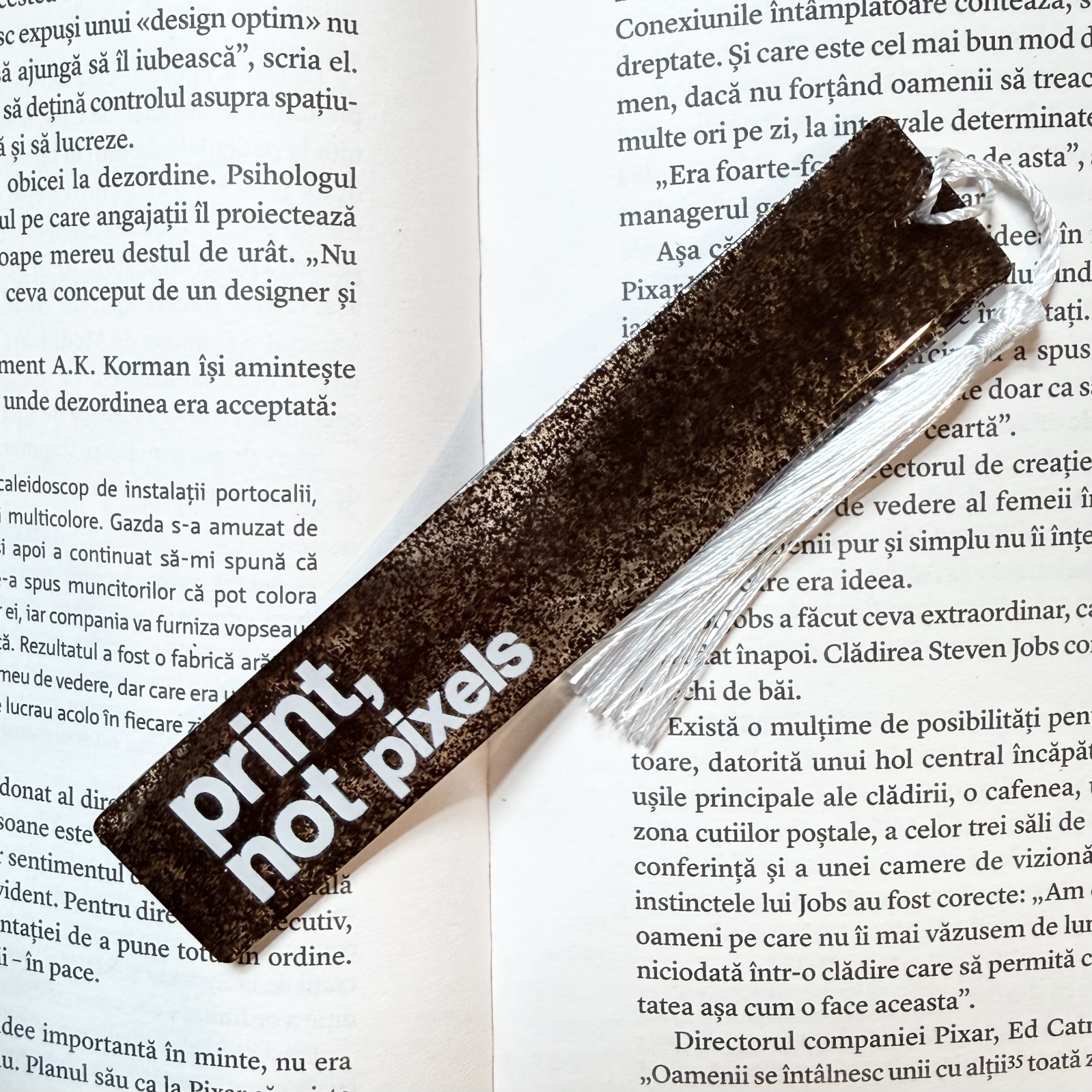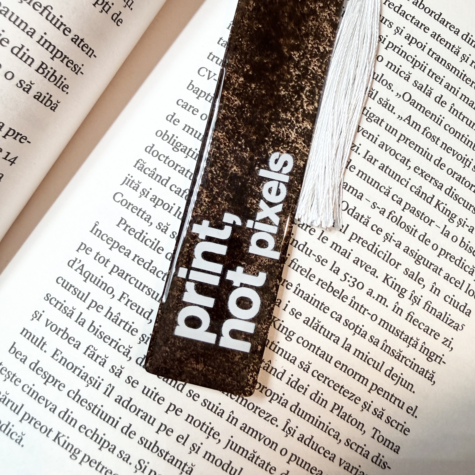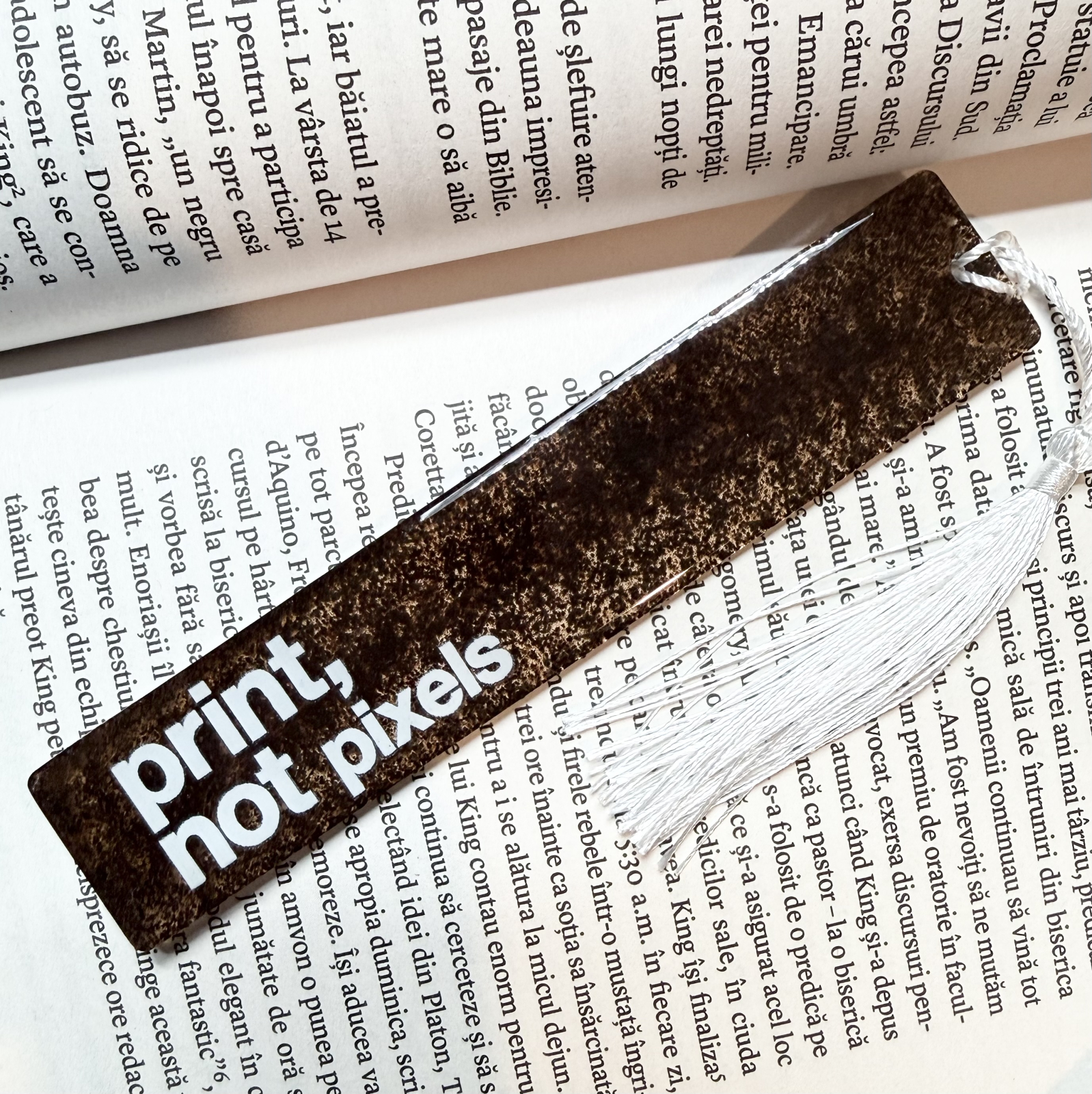 Pentru cititorii care știu că mirosul unei pagini e mai liniștitor decât orice notificare. „Print not Pixels” e un semn de carte turnat cu zaț de cafea, gândit pentru diminețile liniștite sau serile în care timpul stă puțin pe loc.
