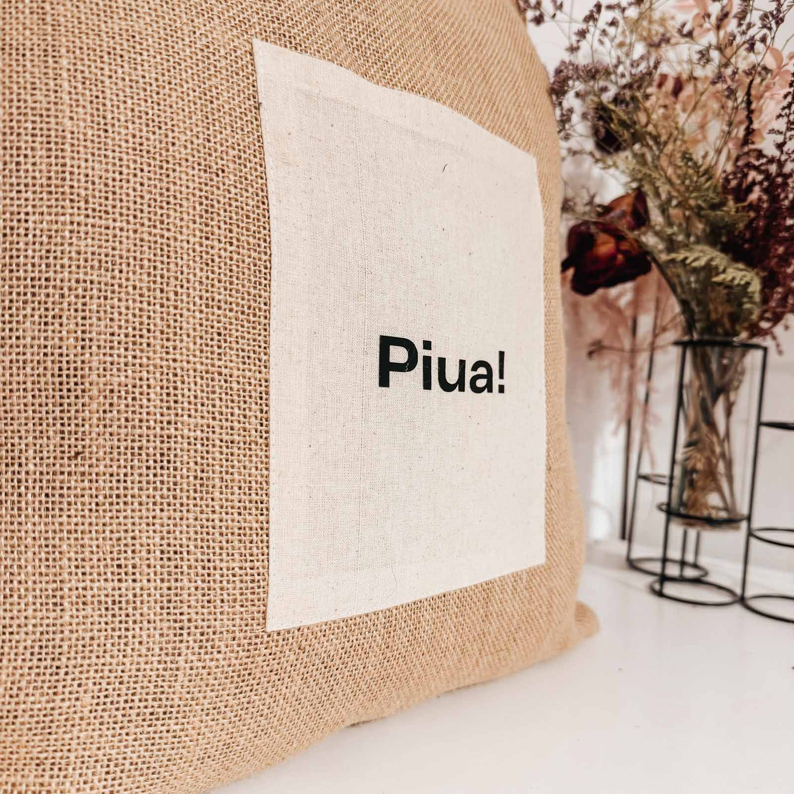 Geanta „Piua” este companionul perfect pentru oamenii care știu că uneori ai nevoie de o pauză mică, bună și meritată - preferabil cu o cafea în mână. Realizată din iută și bumbac, păstrează textura autentică, cu densitatea specifică iutei, ușor translucidă, inspirată din pânza de sac folosită la sacii de cafea. Un detaliu care o ancorează vizual în coffee culture și în universul BeanBling.