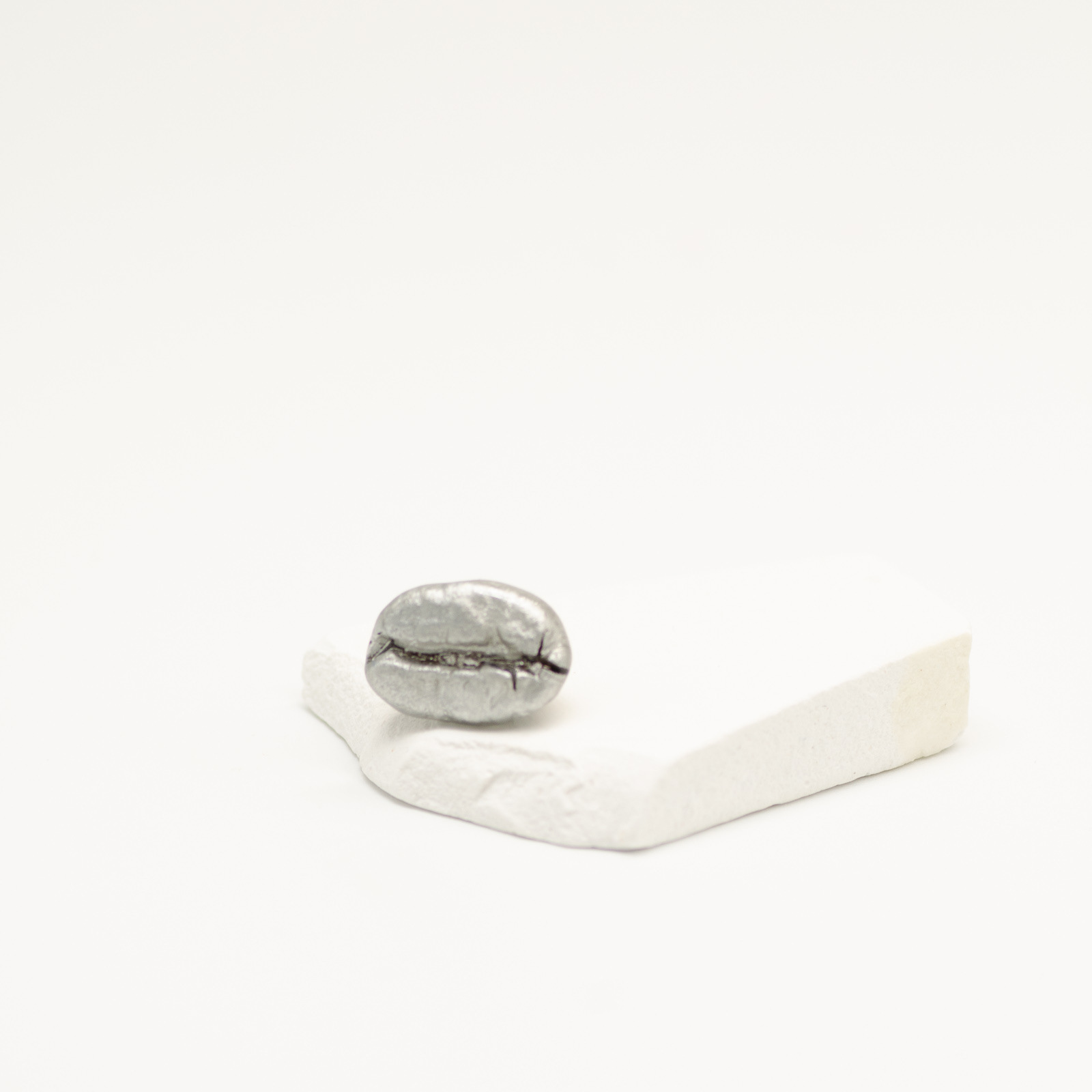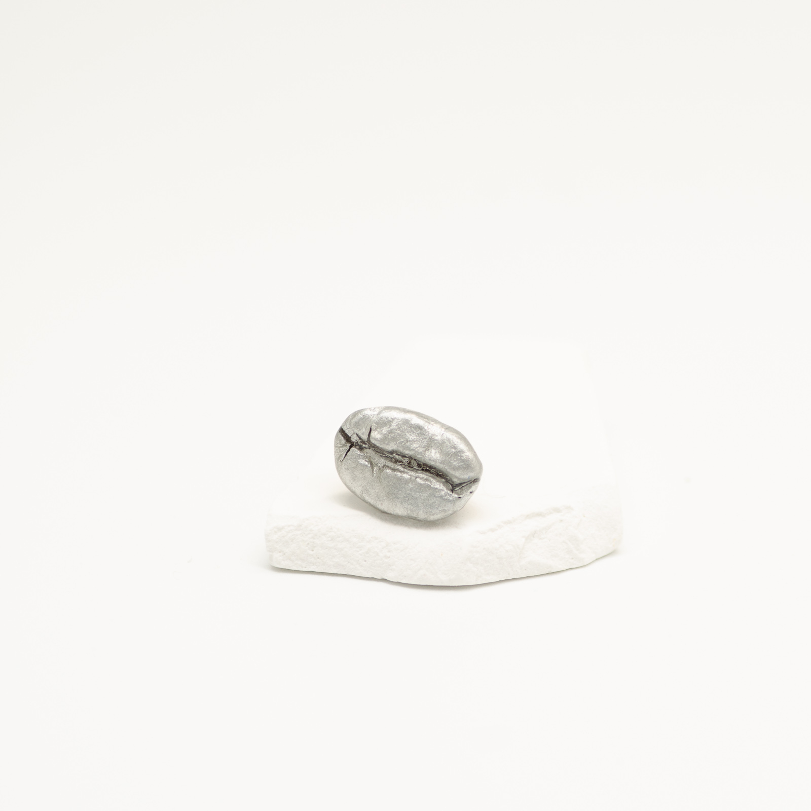 Mărțișor-bijuterie cu un bob real de cafea, în variantă mai mare decât modelele clasice, scăldat în rășină transparentă pe un fundal argintiu. Designul e foarte clar: un singur bob de cafea pus în prim-plan, cu reflexe reci de silver. Vezi textura bobului, volumul, forma lui organică – fără artificii în plus.