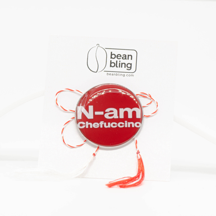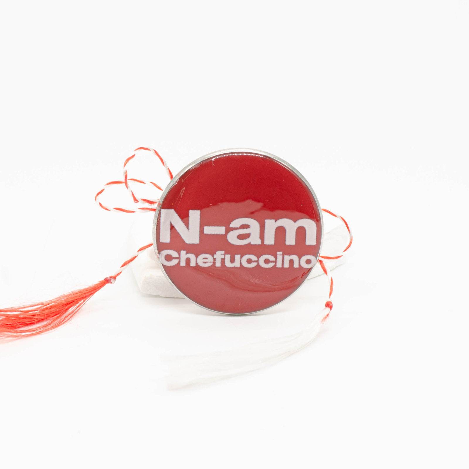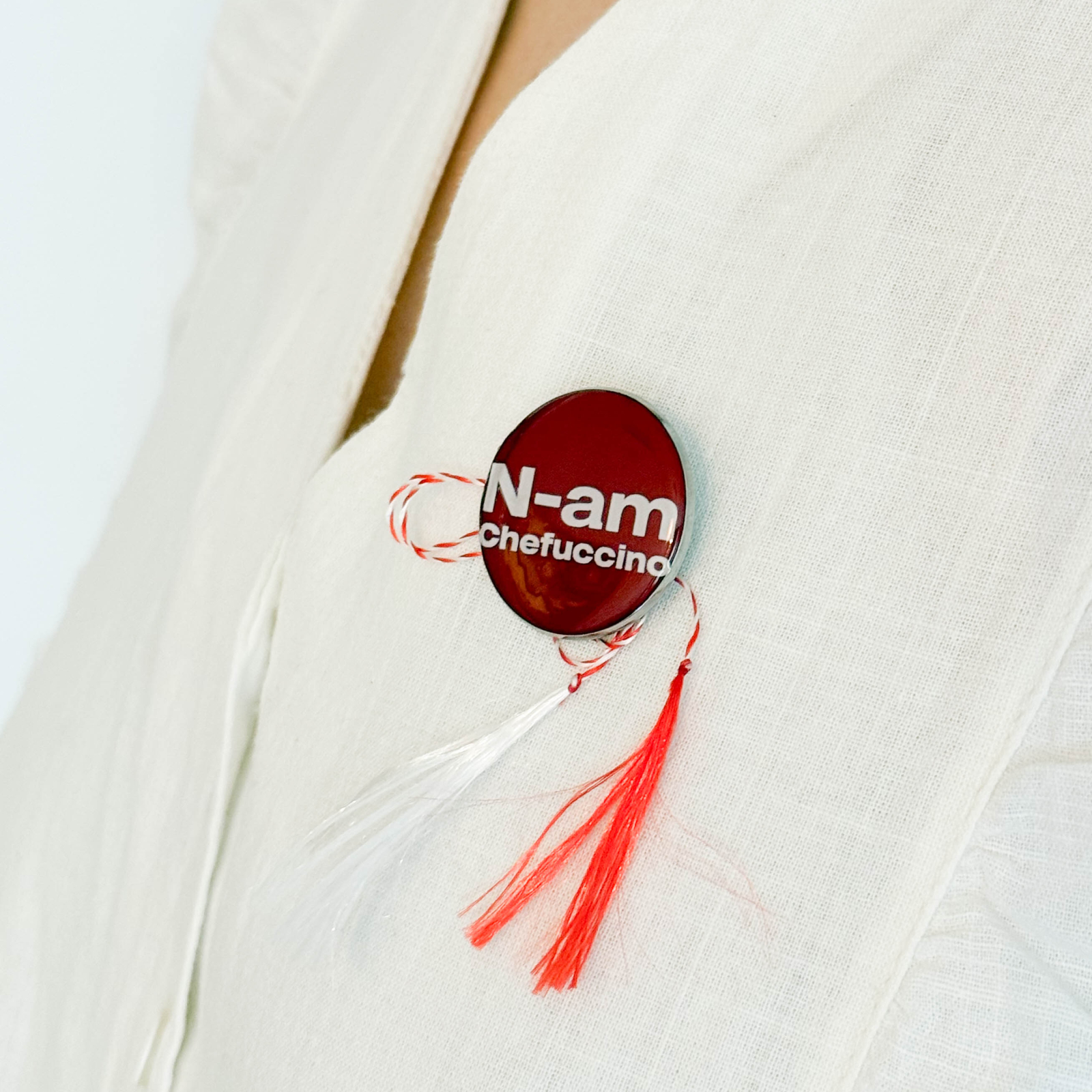 Mărțișor-bijuterie tip broșă/pin, rotund, cu mesajul „n-am chefuccino” scris alb, pe fundal roșu intens. Este versiunea mini a cănii cu același text, gândită să stea la vedere pe sacou, cardigan, hanorac sau geantă. Roșul transmite clar „stop, nu acum”, dar într-un mod jucăuș, nu agresiv.