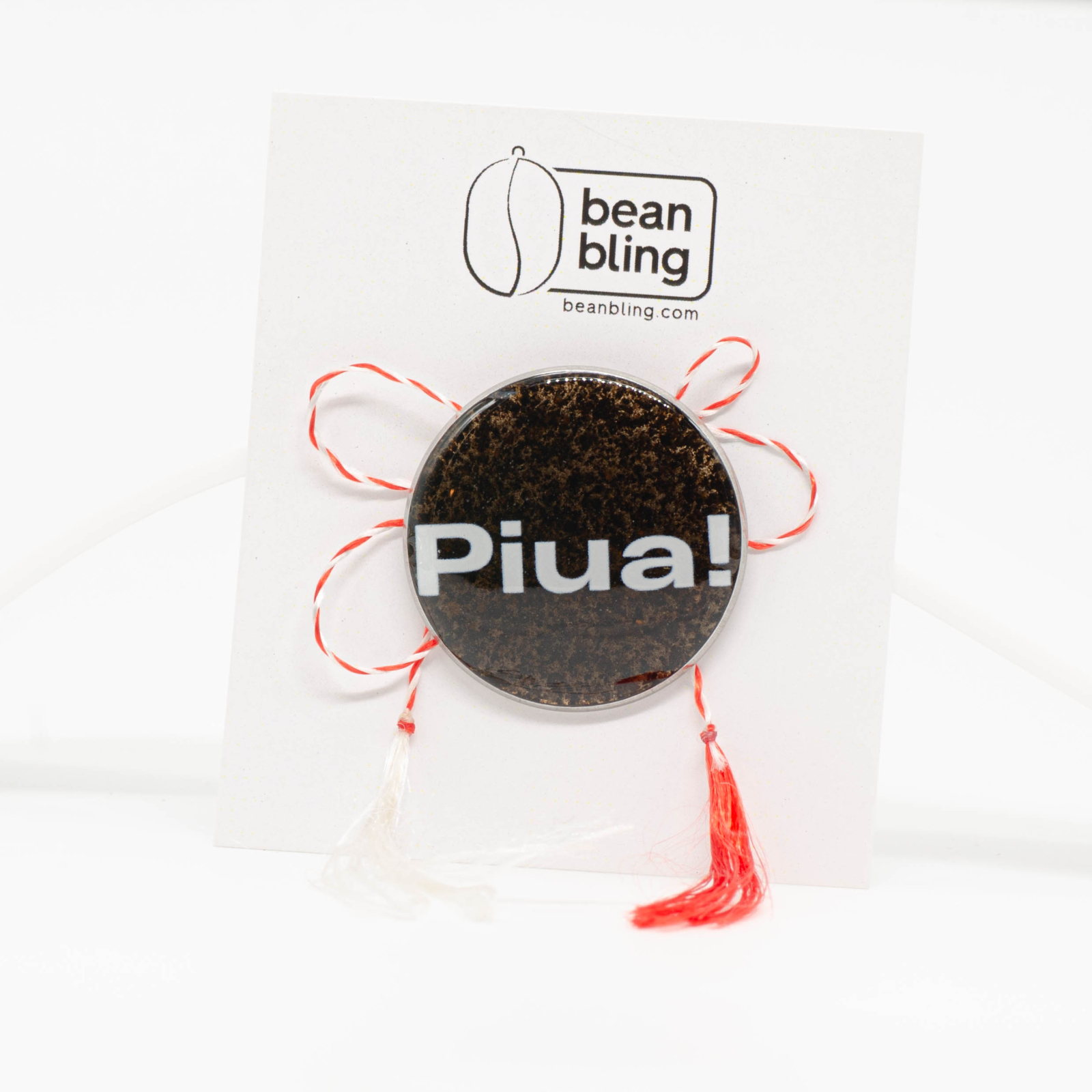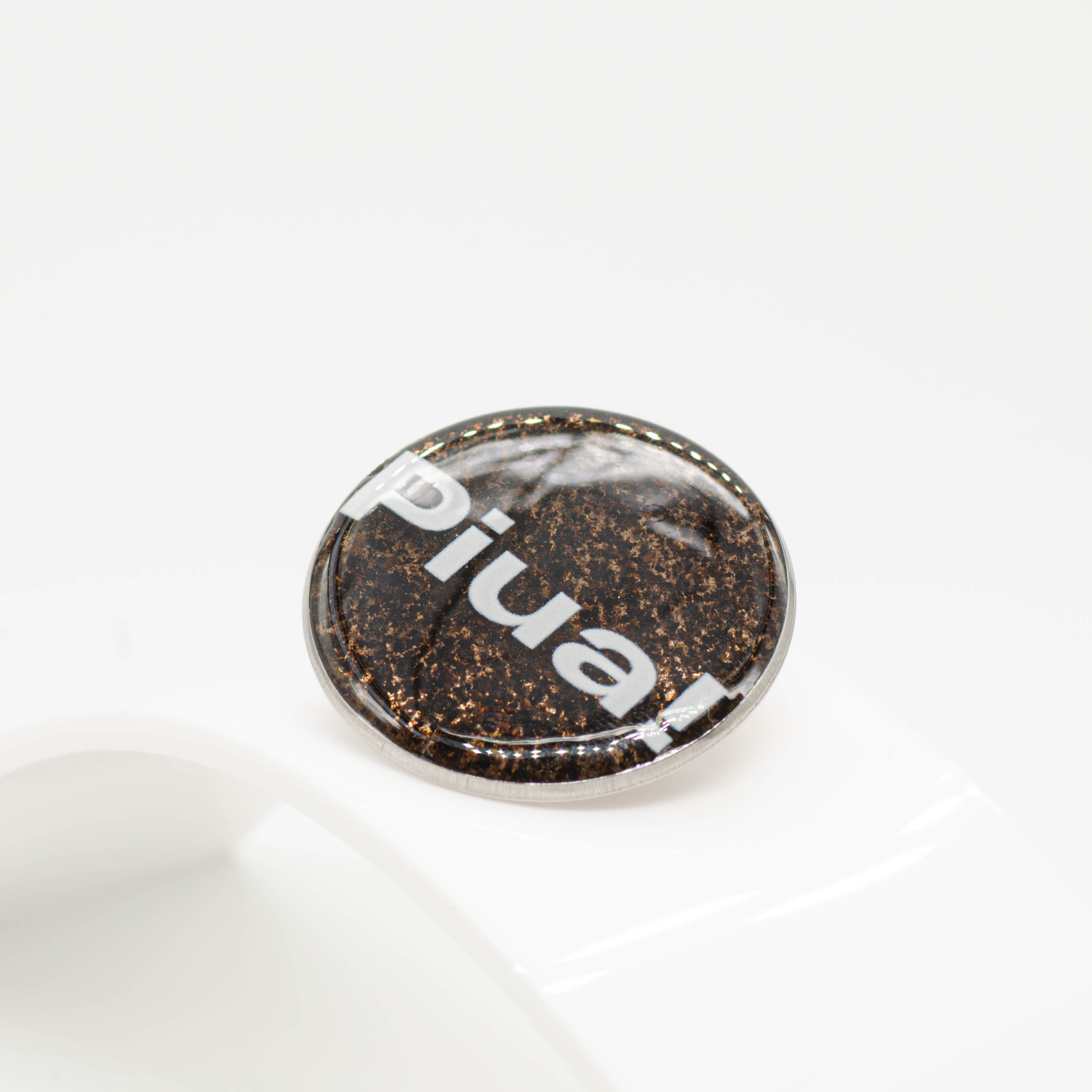 Broșă pin cu mesaj „Piua”, în care textul alb stă peste un fundal lucrat din zaț de cafea prins în rășină. Zațul se vede clar sub text, cu textură organică, și păstrează nota foarte BeanBling: nu e doar un cuvânt simpatic, e o pauză scrisă direct în cafea.