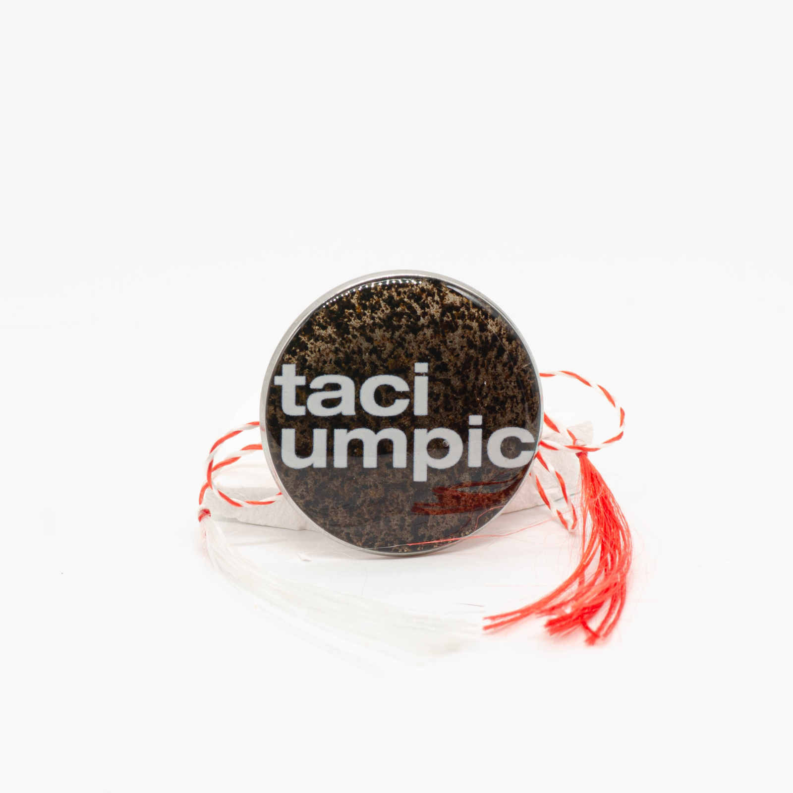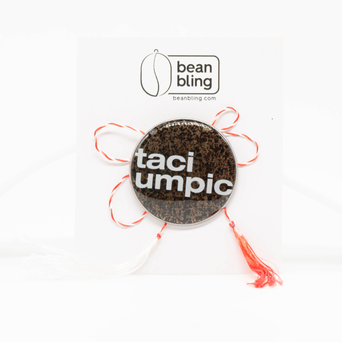 Mărțișor-bijuterie tip broșă/pin, rotund, cu mesajul „taci umpic” scris alb, peste un fundal lucrat din zaț de cafea prins în rășină. Textura de zaț rămâne vizibilă, ca un pattern natural, așa că se vede din prima că e un obiect pentru coffee lovers, nu doar un badge cu text simpatic. Finisajul este lucios, curat, astfel încât mesajul se citește ușor.