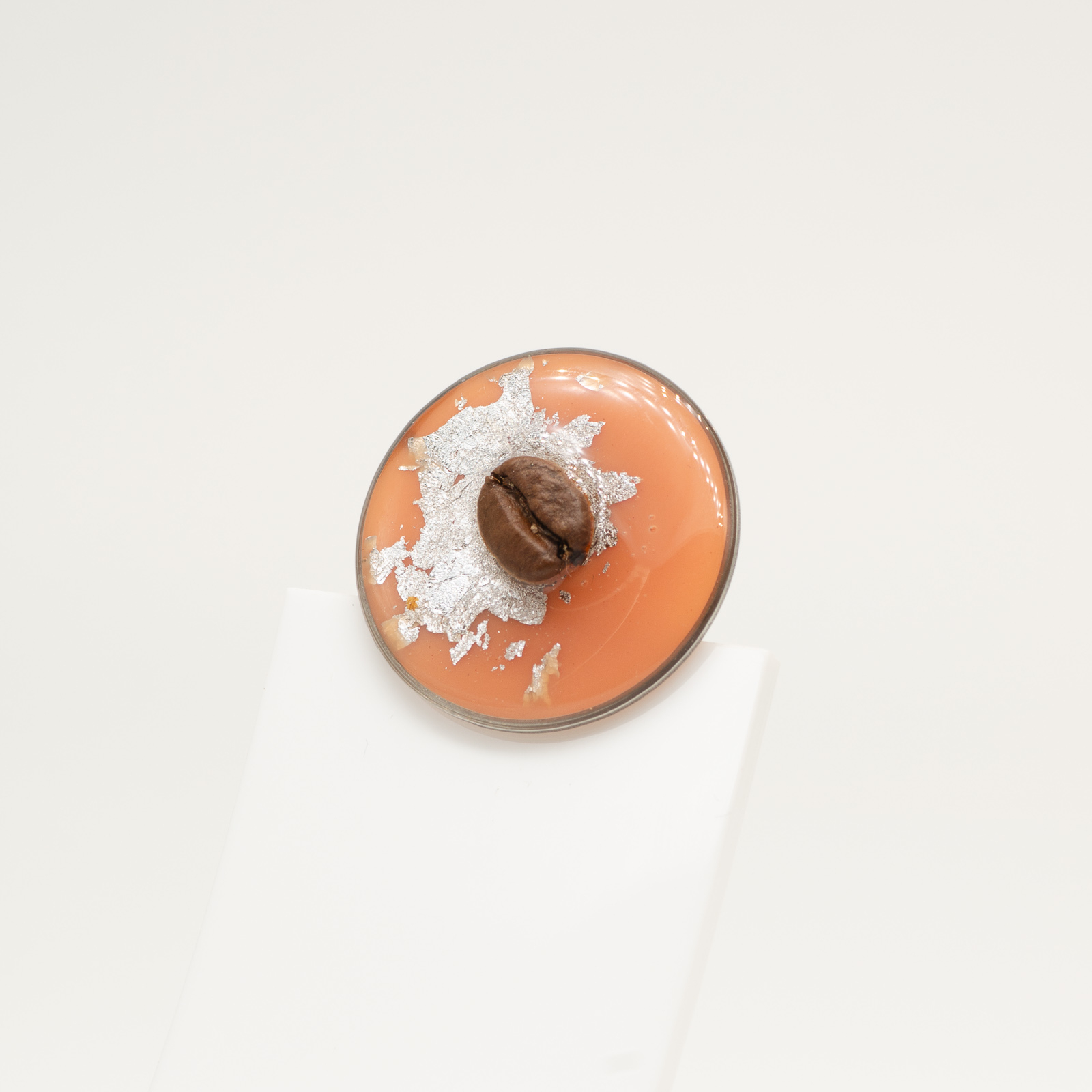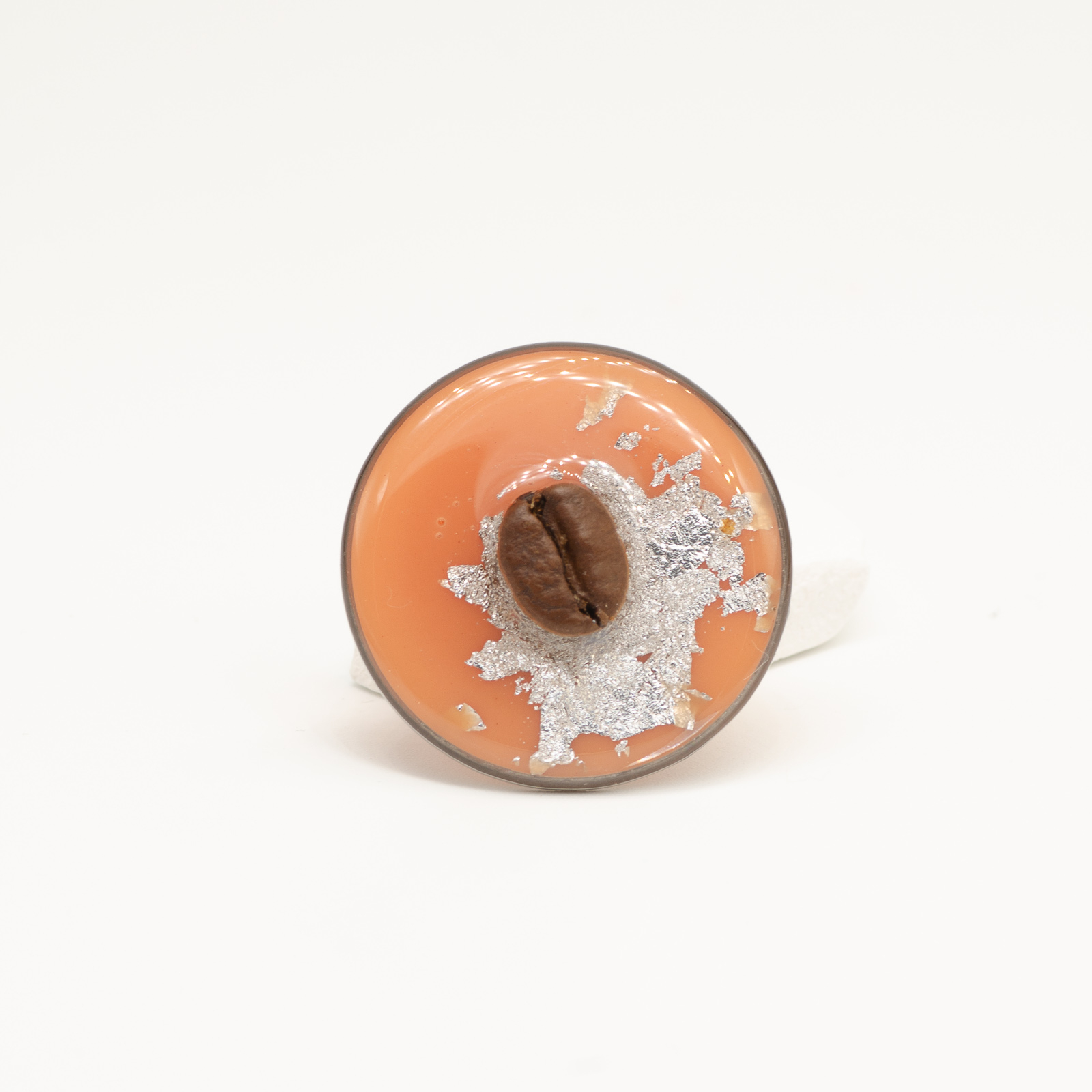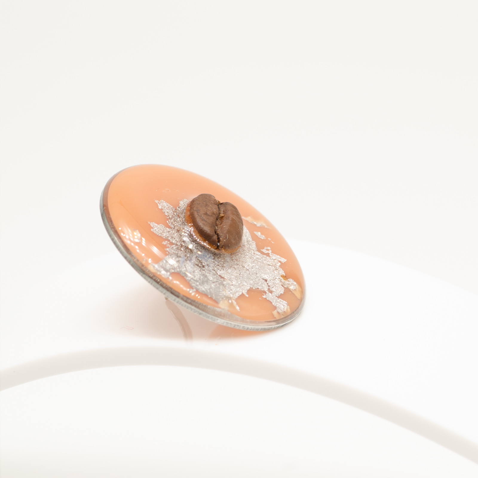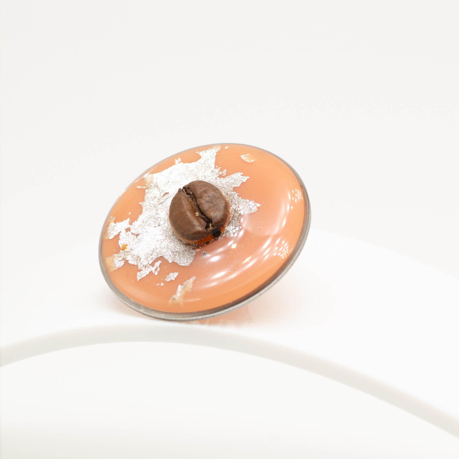 Mărțișor-bijuterie cu bob de cafea real, montat într-un disc rotund cu fundal crem - latte lucios și foiță metalică argintie. Contrastul dintre boaba închisă la culoare și reflexele reci de argint îl face vizibil, dar păstrează un aer curat și elegant.