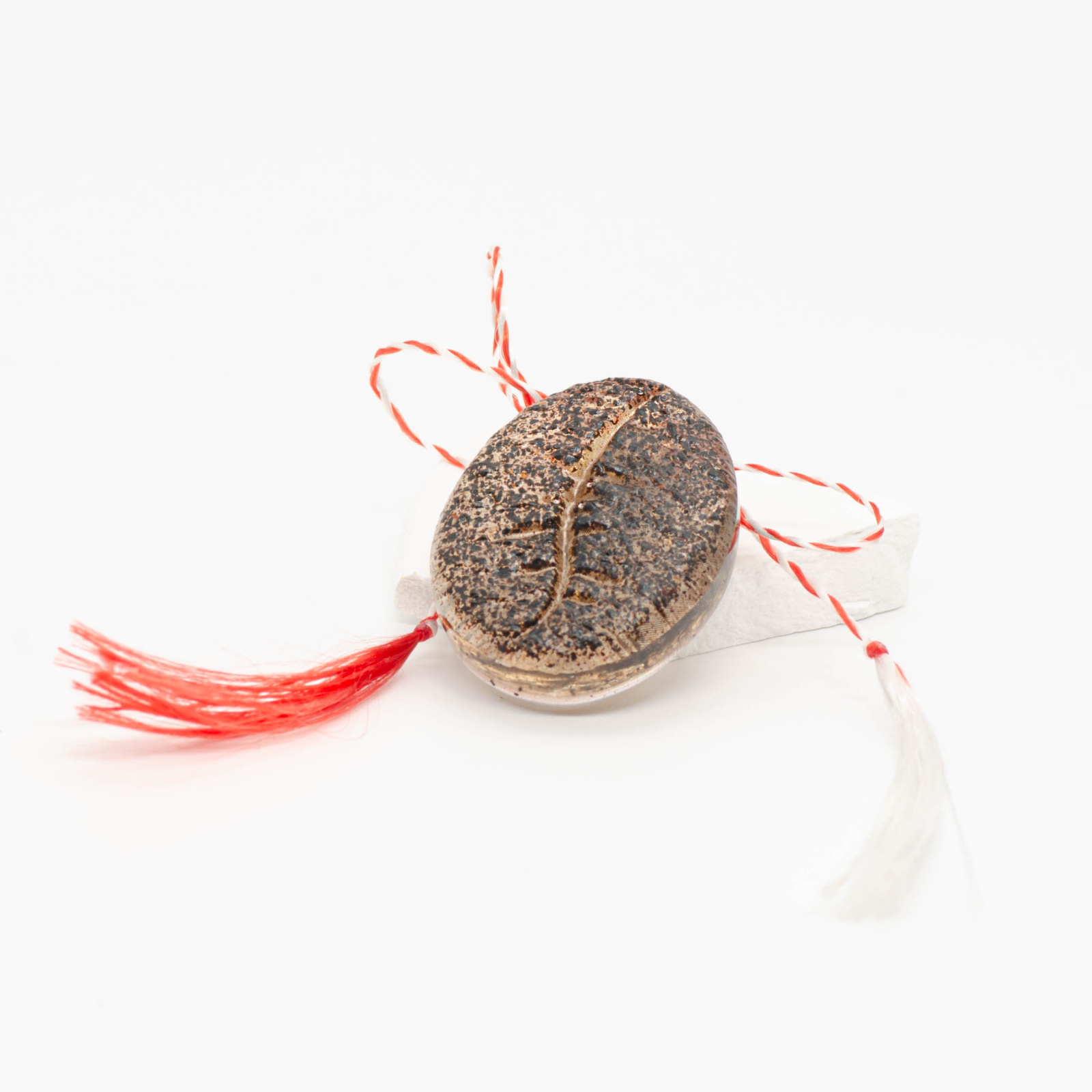 Mărțișor-bijuterie în formă de bob de cafea stilizat, oversize, de aproximativ 3 cm. Este lucrat cu zaț, prins în rășină cu finish mat, organic, fără luciu. Textura de zaț rămâne la vedere și dă piesei un look raw, foarte sincer, mai aproape de „obiect de design” decât de mărțișor clasic.