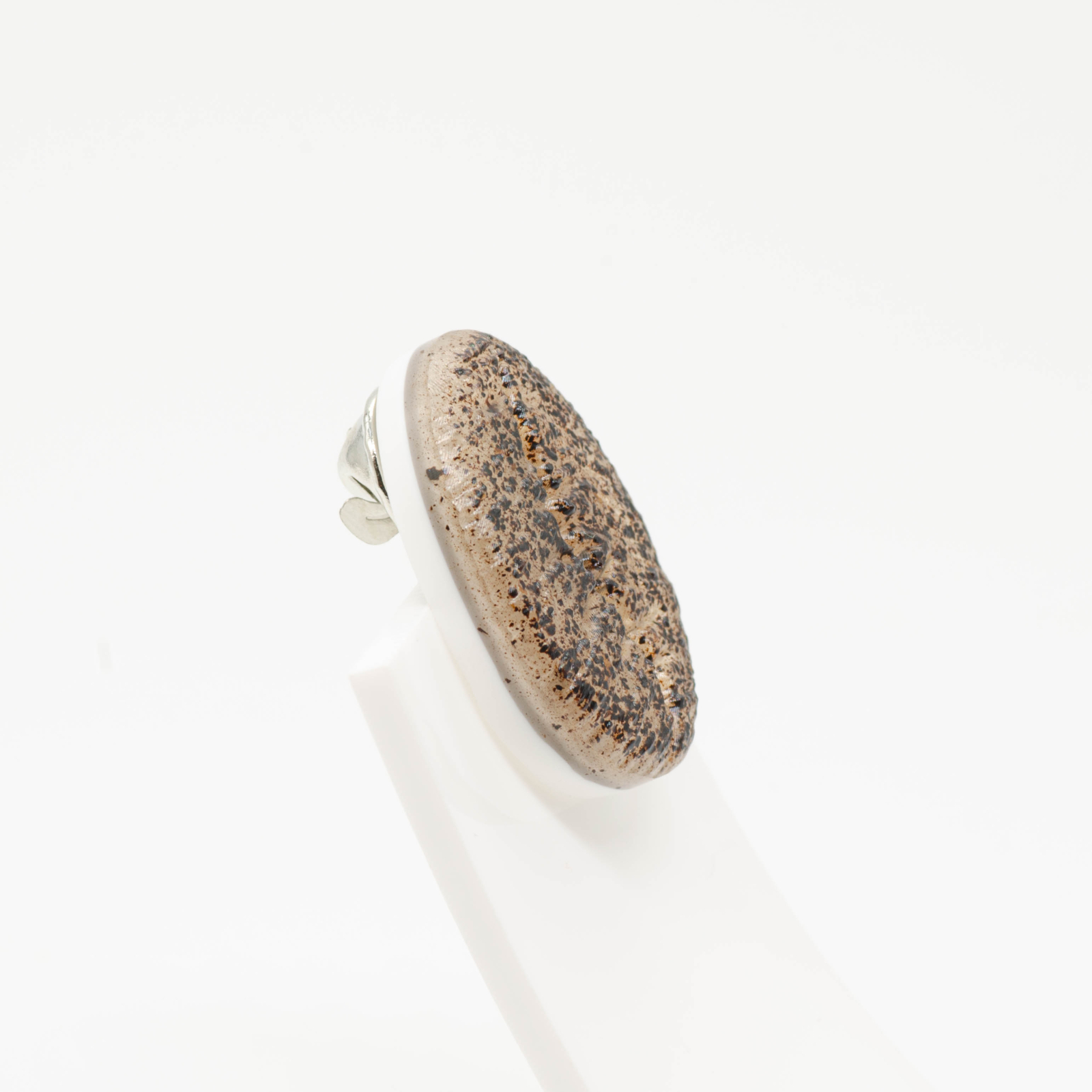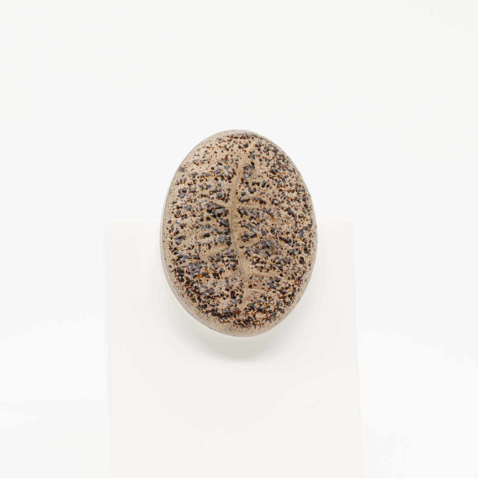 Mărțișor-bijuterie în formă de bob de cafea stilizat, mare, de aproximativ 3 cm – o piesă statement care se vede din prima. Este lucrat cu zaț de cafea real, prins în straturi de rășină cu finish mat, organic, fără luciu. Forma rămâne convențională (bob de cafea clar recognoscibil), dar detaliile de textură sunt complet organice și raw.
