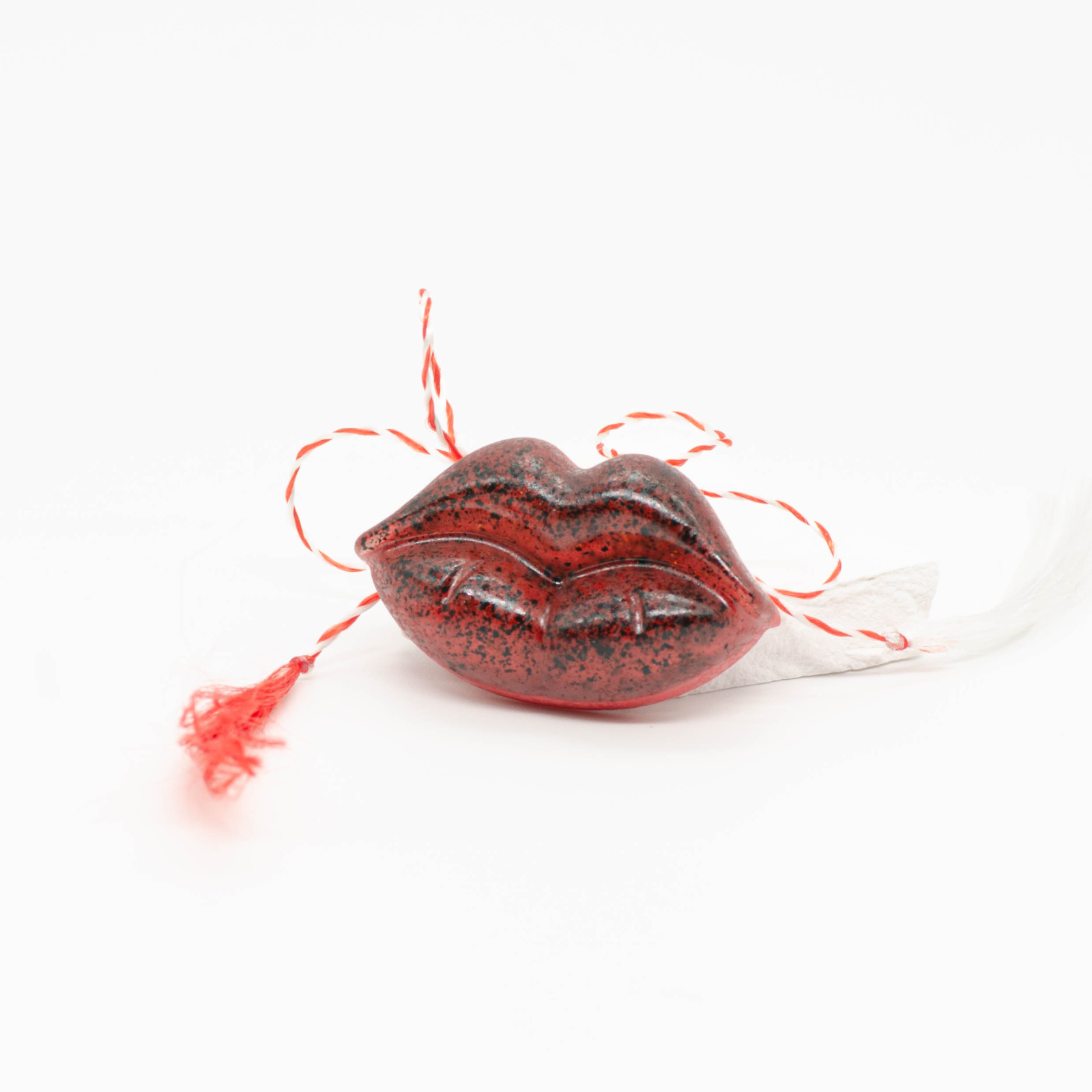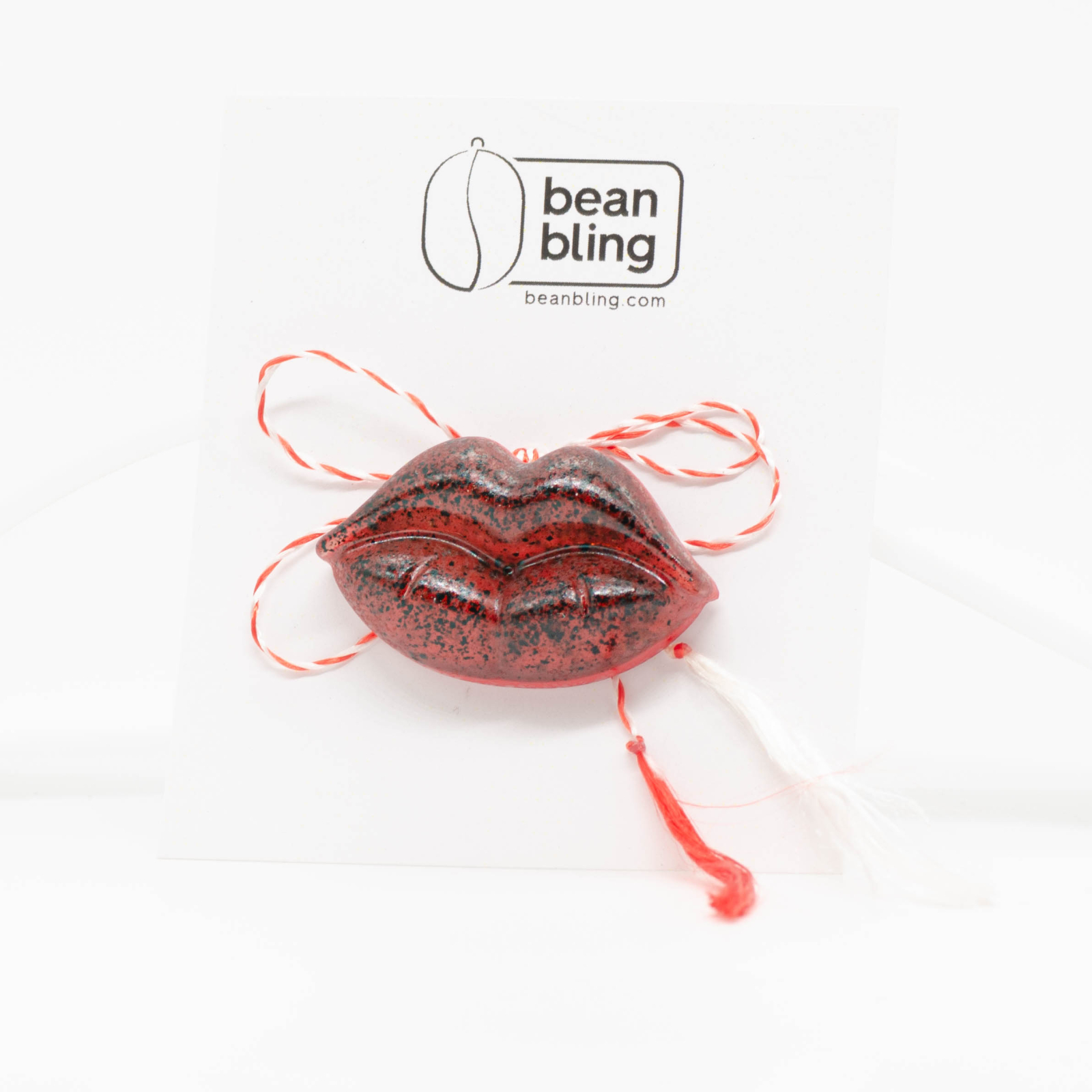 Mărțișor-bijuterie în formă de buze, cu incluziuni de zaț de cafea și luciu mediu, controlat. Textura de zat se vede discret, ca un pattern fin, iar forma clară de buze îl face să fie un accesoriu fun, ușor senzual, dar în continuare smart și purtabil la birou.