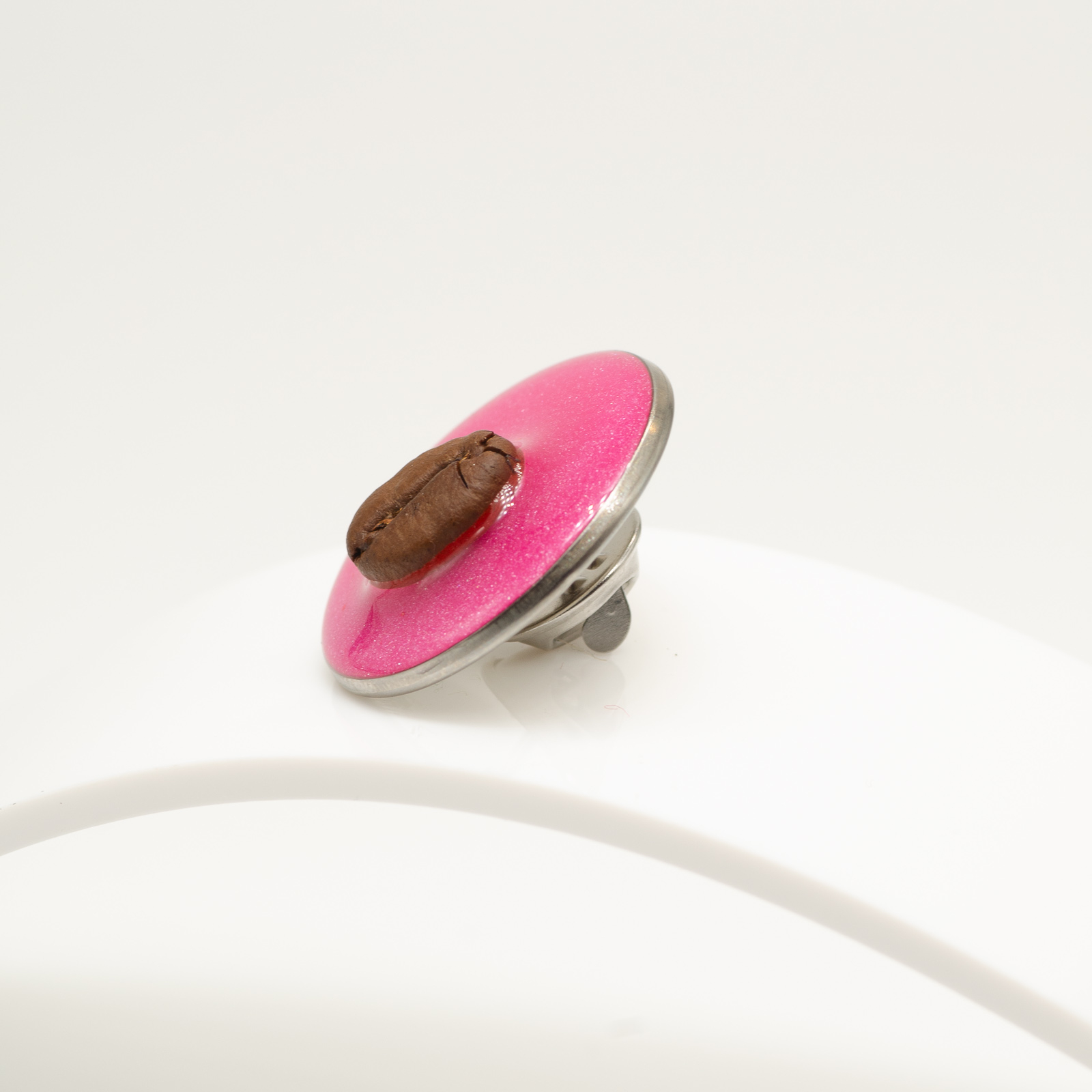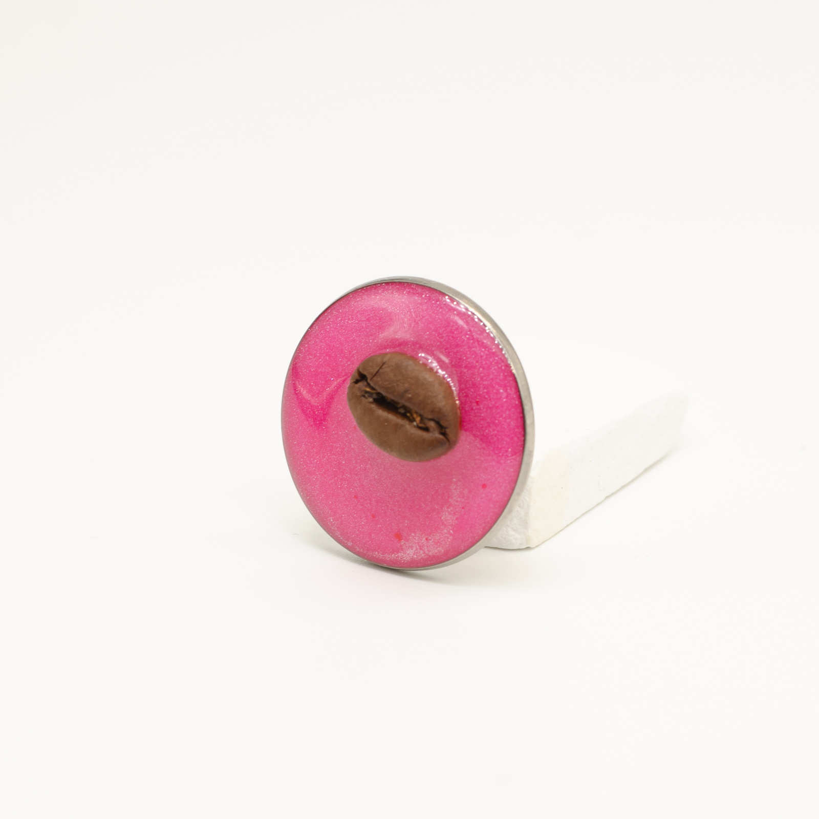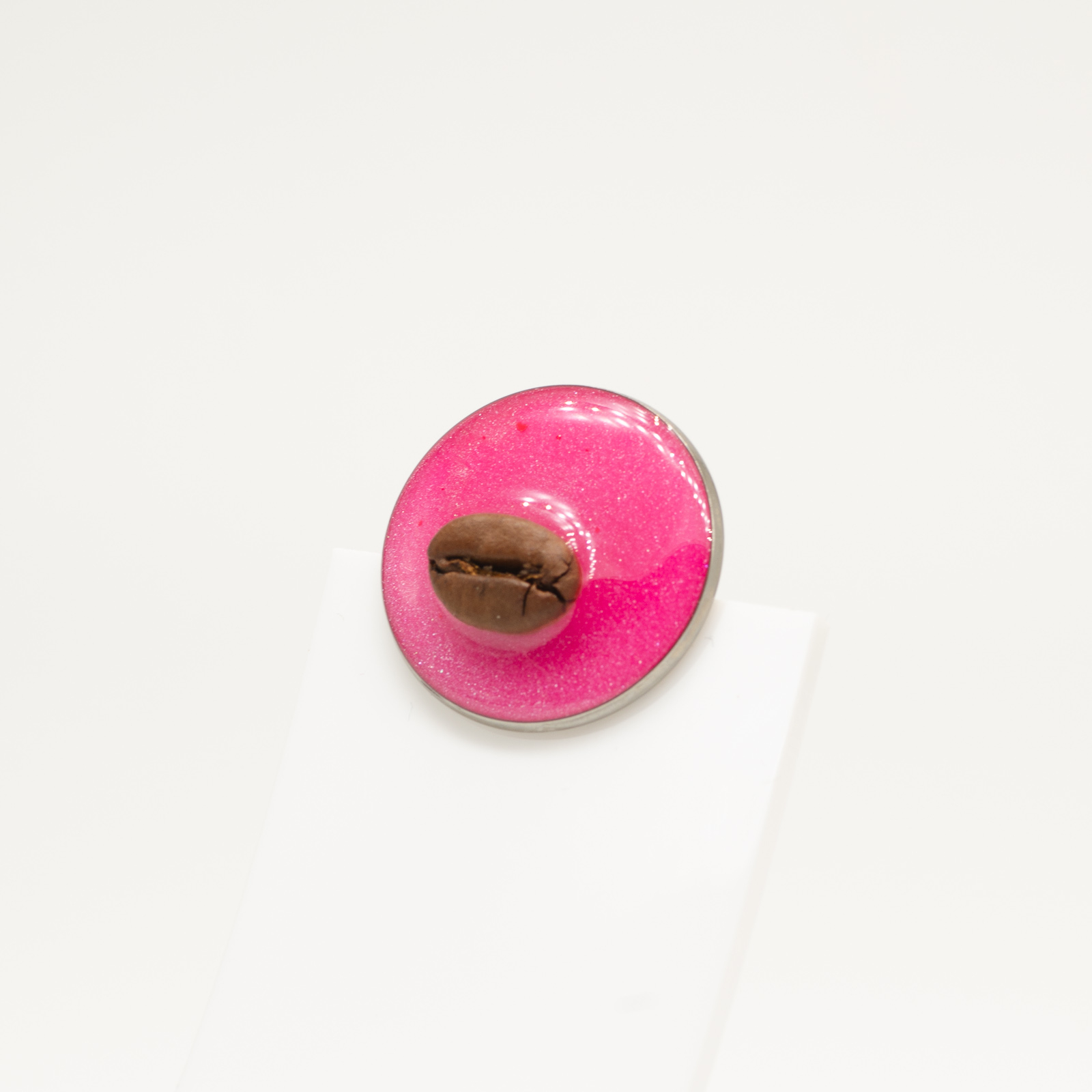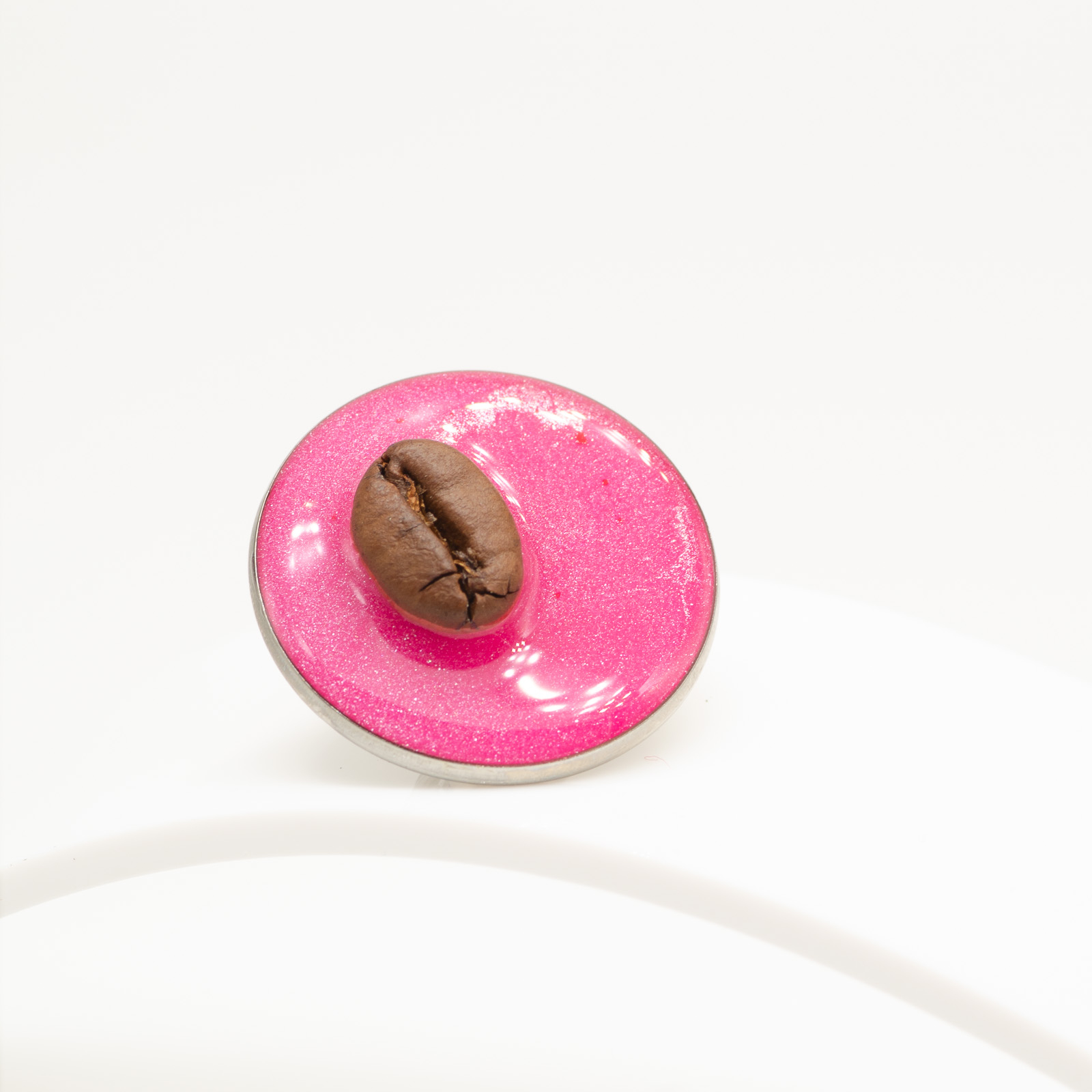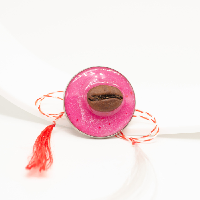 Mărțișor-bijuterie rotund, cu bob de cafea așezat central pe un fundal roz intens, cu particule fine de sclipici. Arată ca un SweetPie compact: foarte mult „dulce” într-o piesă mică, cu un contrast puternic între rozul energic și cafeaua organică din centru.